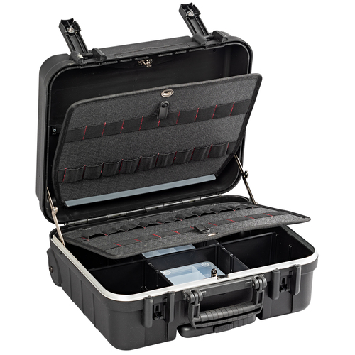 · 2 paneles portaherramientas con elásticos - cerradura central con llave - asa ergonómica cromada - 1 asa telescópica (trolley) + 2 ruedas - 1 compartimento para documentos - compartimento interior con divisores ajustables - etiqueta para nombre y dirección.
