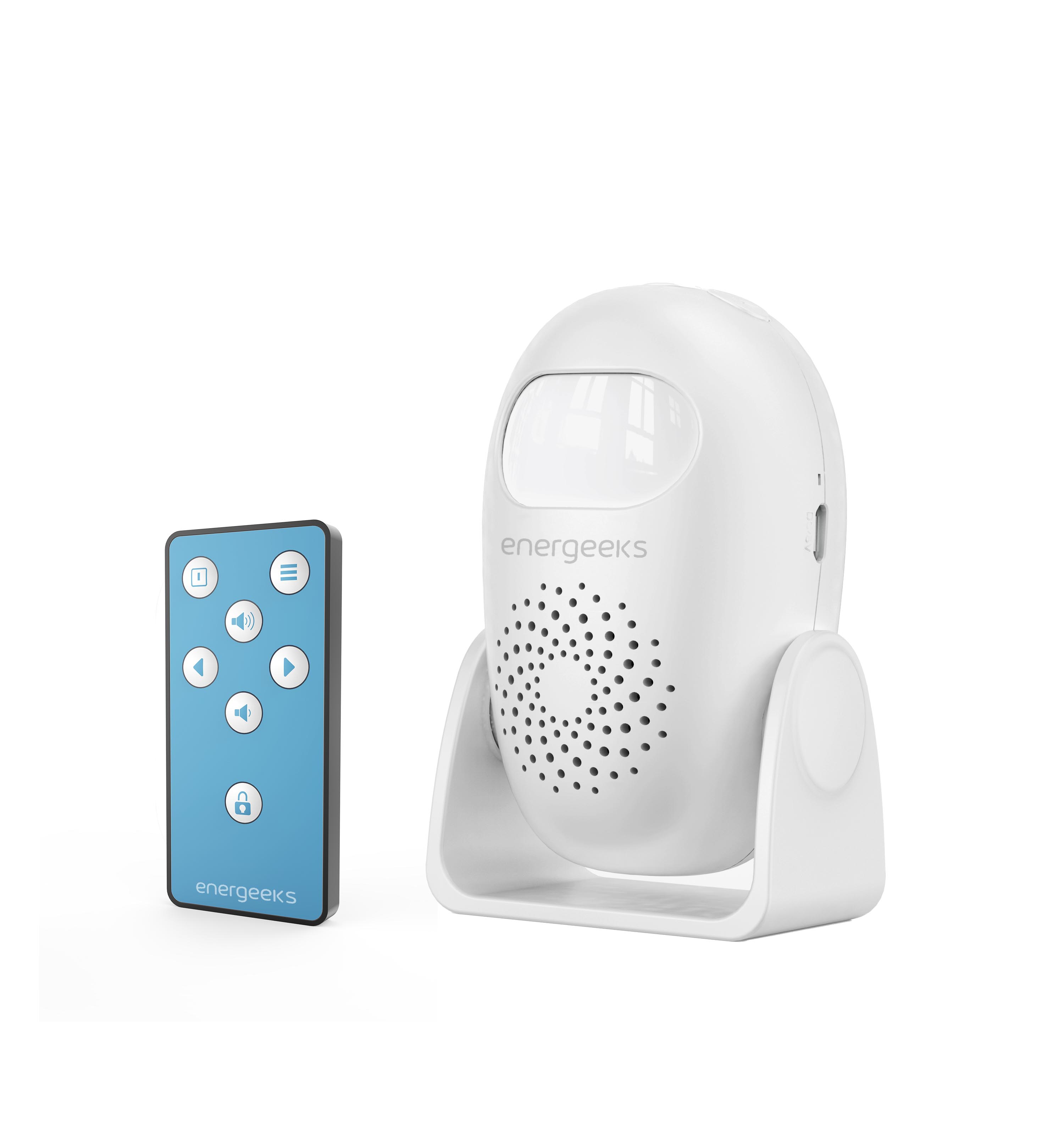 Mini alarma timbre Wifi con detector de movimiento y mando a distancia. Ideal para comercios, emite un sonido - timbre cuando detecta movimiento, lo que te permite saber si alguien ha accedido a tu negocio. Dispone de función alarma en vez de timbre. Además, recibirás notificaciones en tu teléfono a través de la app Energeeks 3.0.