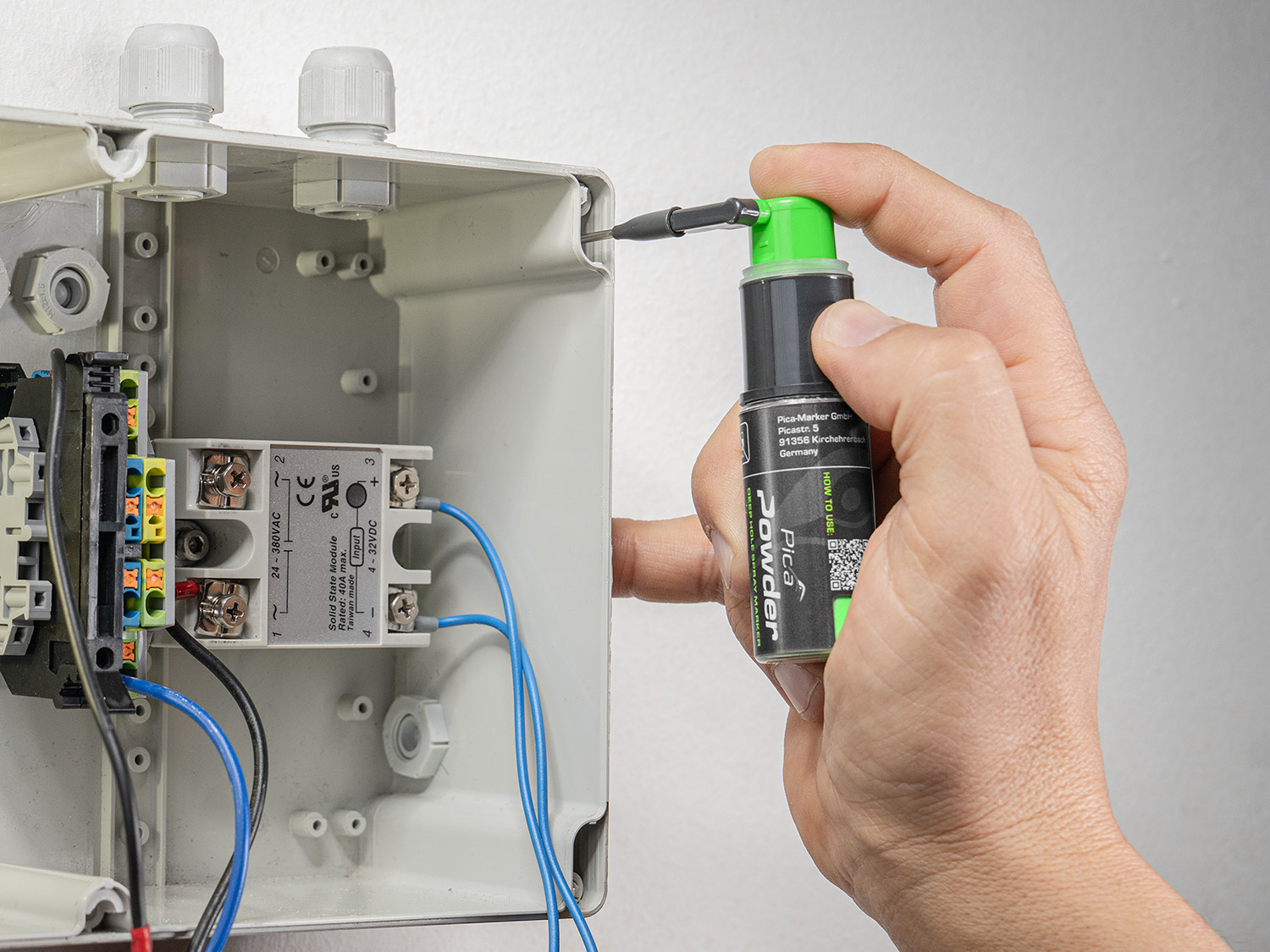 El marcador Pica en Polvo está diseñado para profesionales que necesitan realizar marcas precisas en orificios profundos y de difícil acceso. Gracias a su mecanismo de bombeo sin gas (ZERO GAS) y a su brazo pulverizador capaz de llegar hasta