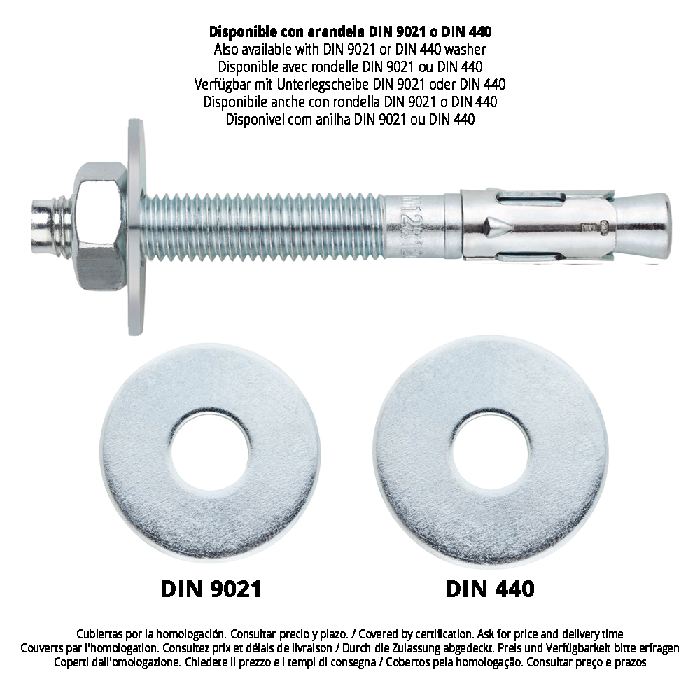 Anclaje metálico tipo perno o tipo cuña, de expansión por par controlado (funcionamiento por rozamiento) con rosca externa, de acero al carbono con recubrimiento cincado en eje y clip, con rosca macho. Adecuado para la instalación de fijaciones estructurales en hormigón no fisurado, para cargas altas estáticas o cuasi-estáticas, para uso en espacios interiores sin condensación.