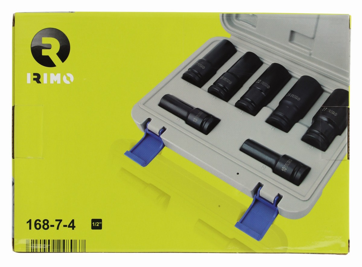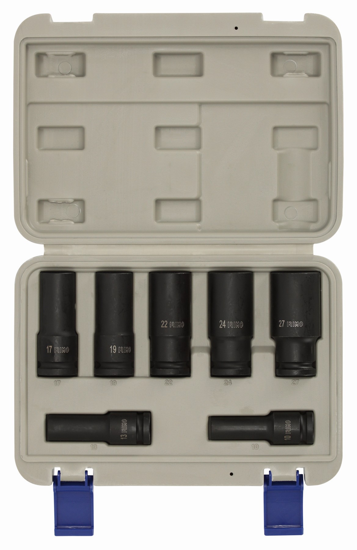 - 7 vasos largos de 1/2": 10mm, 13mm, 17mm, 19mm, 22mm, 24mm, 27mm