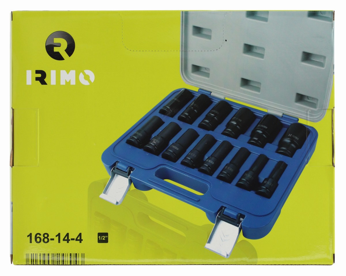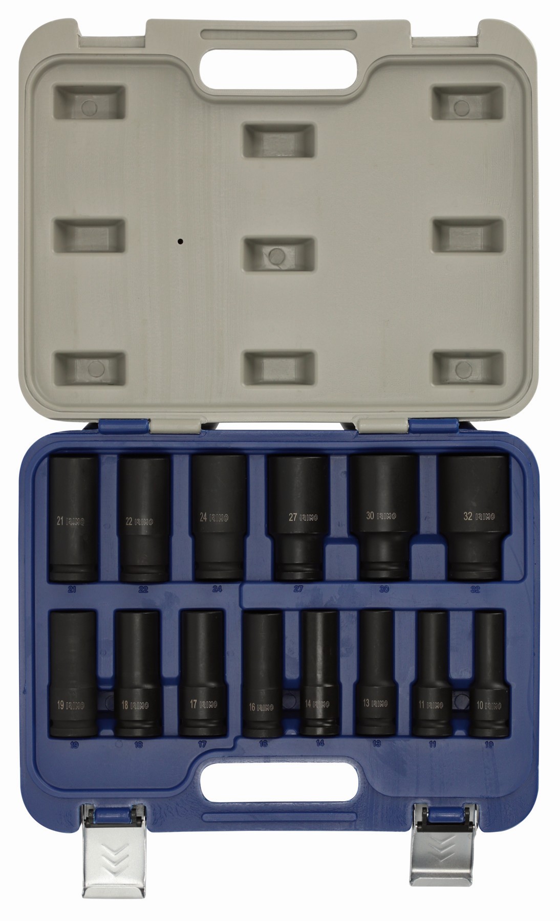 - 14 vasos largos de 1/2": 10mm, 11mm, 13mm, 14mm, 16mm, 17mm, 18mm, 19mm, 21mm, 22mm, 24mm, 27mm, 30mm, 32mm