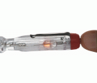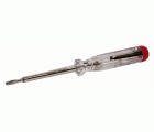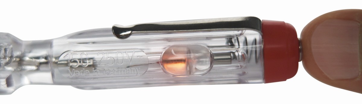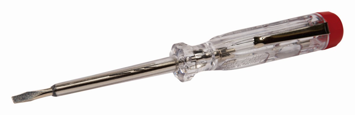 - Comprobador de tensión con mango de plástico transparente y protección de plástico hasta la punta.