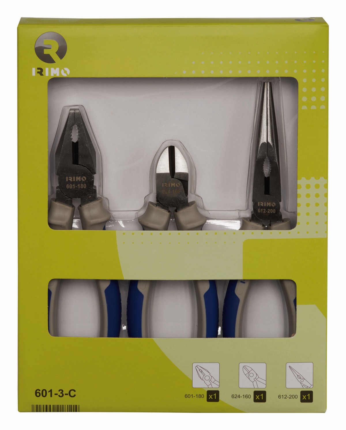 - El juego incluye: alicates de corte diagonal (160 mm), alicates combinados (180 mm) y alicates de boca semirredonda (200 mm).