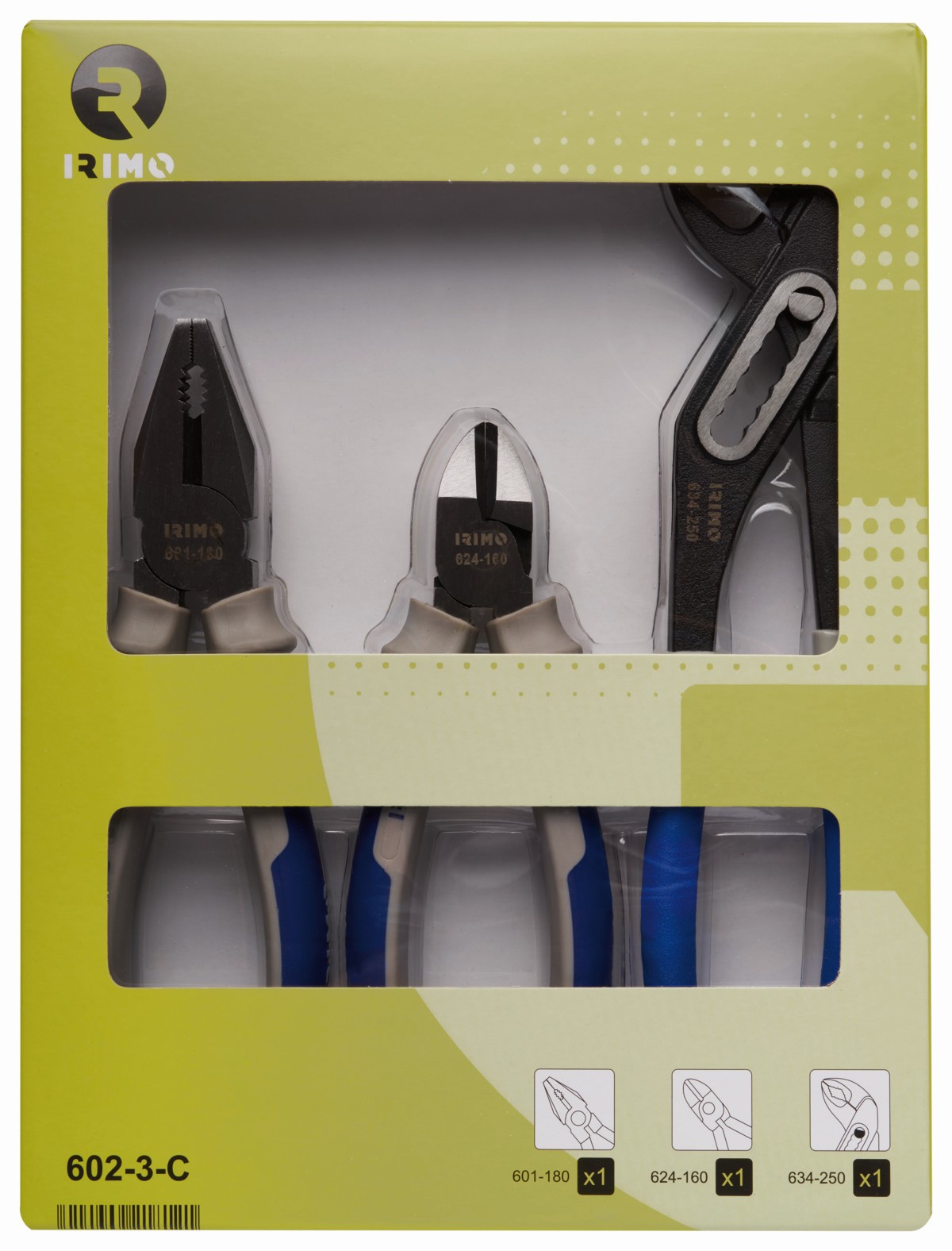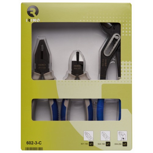 - El juego incluye alicate de corte diagonal (160 mm), alicate universal (180 mm) y tenacilla articulada (250 mm).