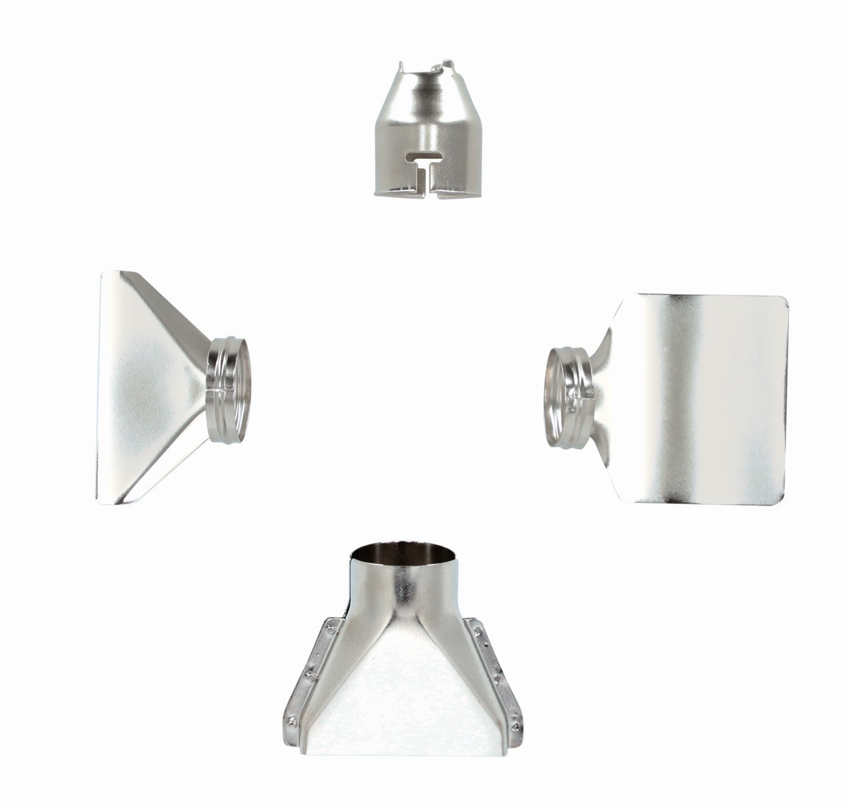 - La boquilla reflectora dispersa el flujo de calor uniformemente alrededor de toda la superficie de trabajo