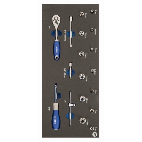 - Componentes: juego de vasos de 1/4"; Carraca; accesorios.