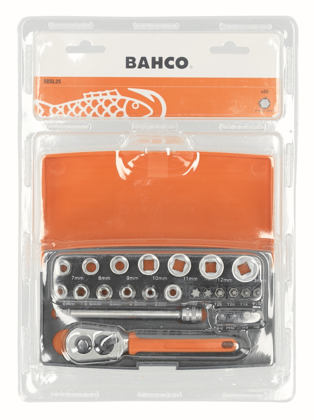 Juego de vasos con cuadrado de 1/4", perfil hexagonal métrico y puntas de destornillador/portapuntas, 25 piezas/caja en blíster | SBSL25