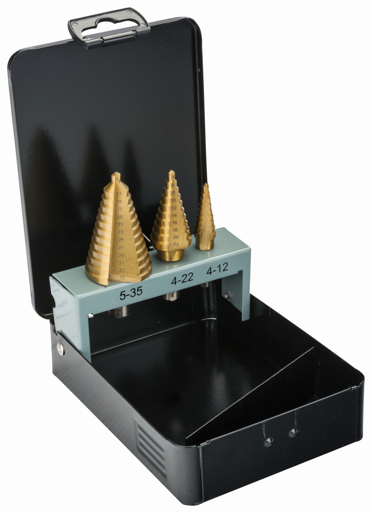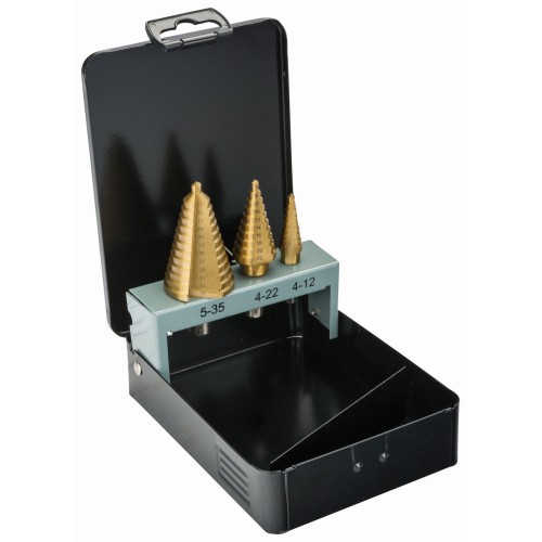 • Juego de brocas escalonadas para taladrar agujeros en láminas de metal finas