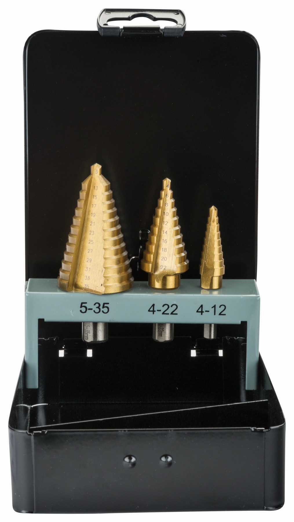 • Las brocas escalonadas recubiertas de nitruro de titanio tienen una dureza exterior que hace que duren entre 4 y 5 veces más que otras puntas para brocas escalonadas comunes