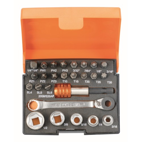 Juego de puntas y vasos estándar de 1/4" para tornillo de cabeza ranurada/ Phillips/Pozidriv/TORX®/Hex - 26 piezas | 2058/S26AF