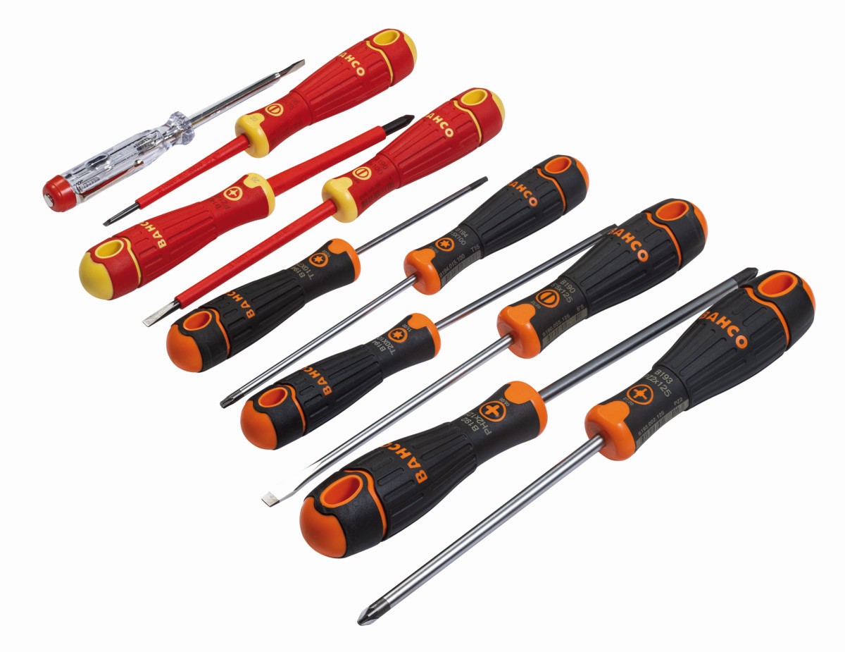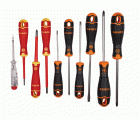 - Juego de destornilladores de 10 piezas para tornillos de cabeza ranurada, Phillips, Pozidriv y TORX® (incluye un comprobador de tensión de 150-250 V).