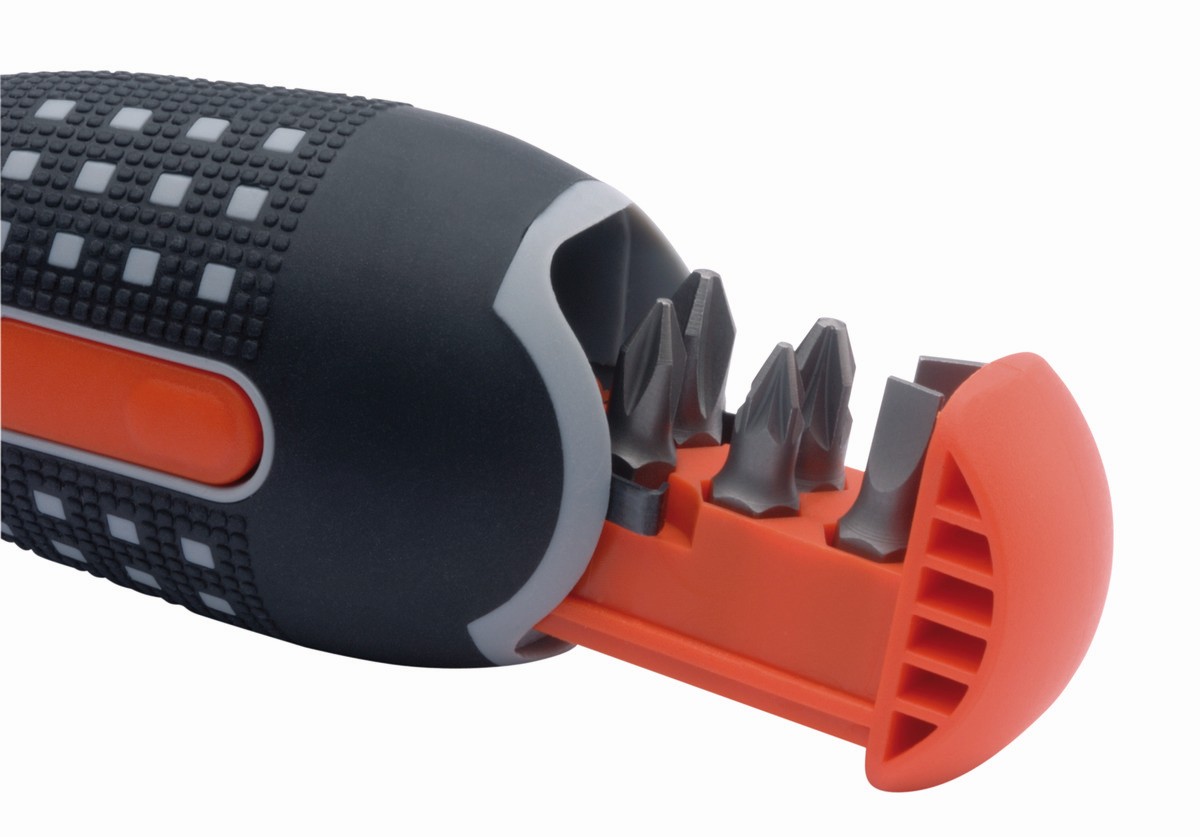 - Compartimento deslizante para almacenar 6 puntas diferentes de forma cómoda y segura: PH 1, PH 2, PZ 1, PZ 2 y 4,5 y 5,5 ranuradas.