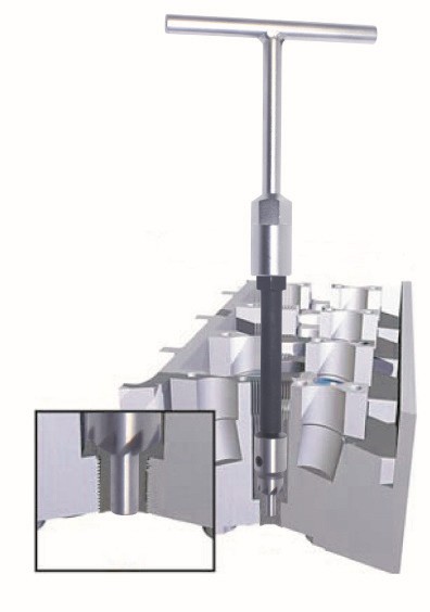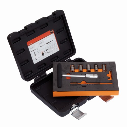 • Este juego de cinco escariadores para inyectores diésel se usa para limpiar el asiento del inyector y garantizar que tiene las medidas correctas cuando se sustituye o repara el inyector