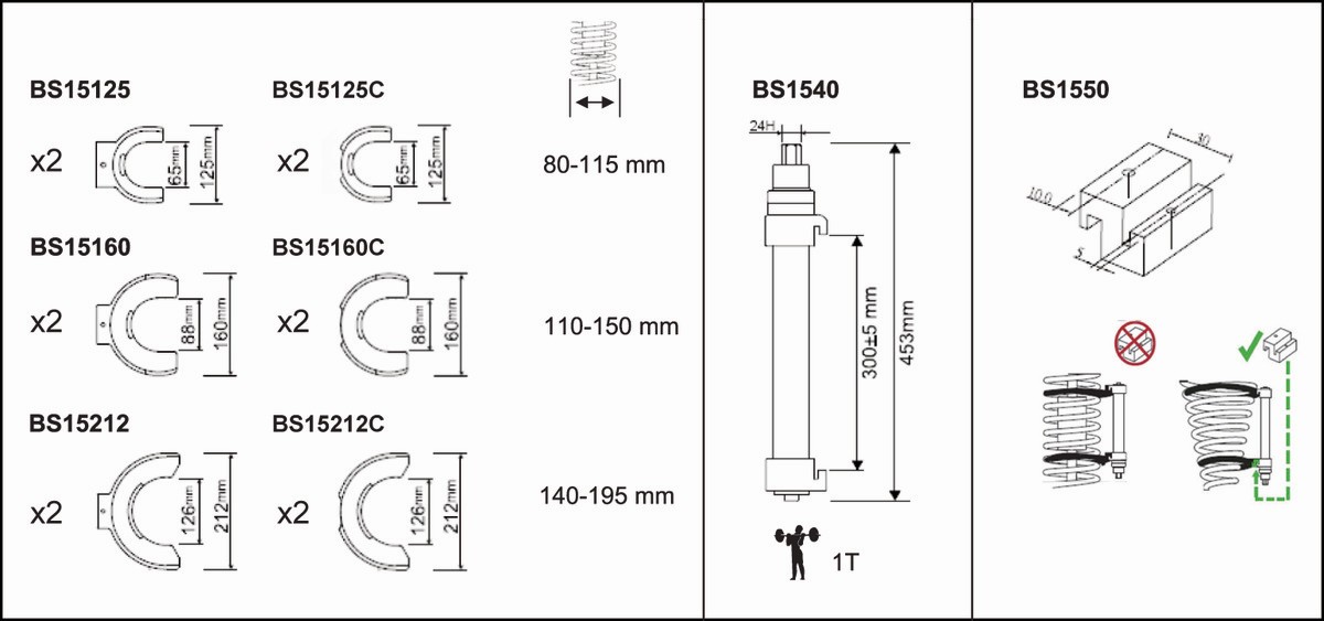 - Tres pares de mordazas con fundas de plástico (Ref. BS15125, BS15160, BS15212] para proteger el muelle