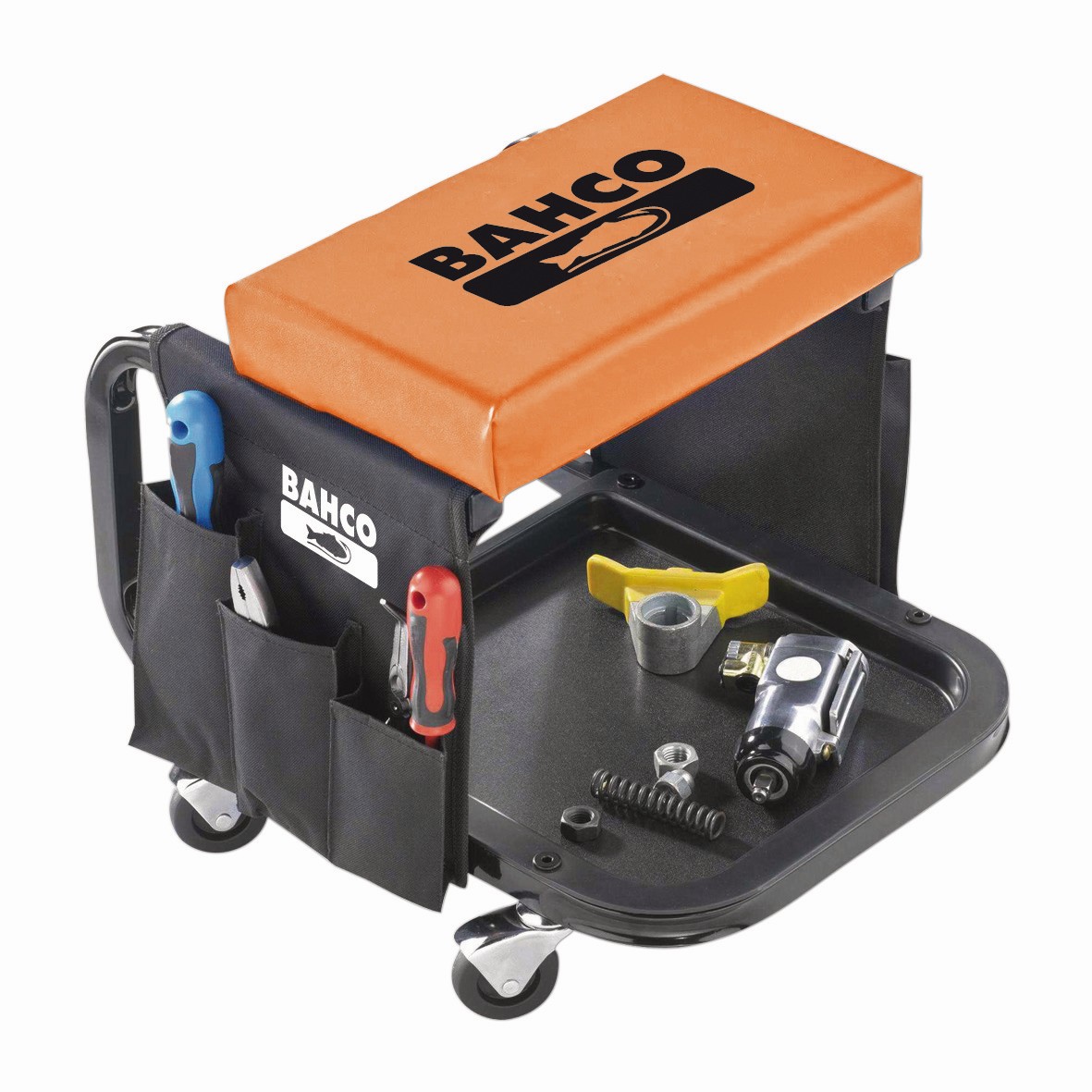 - Equipado con dos bolsillos y una bandeja para guardar herramientas, piezas o accesorios
