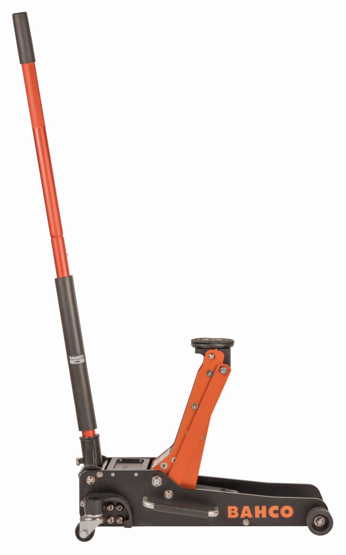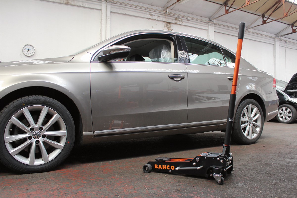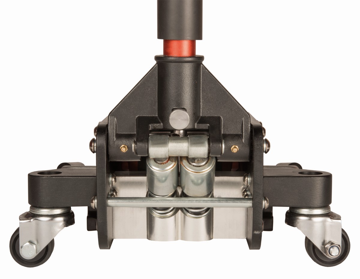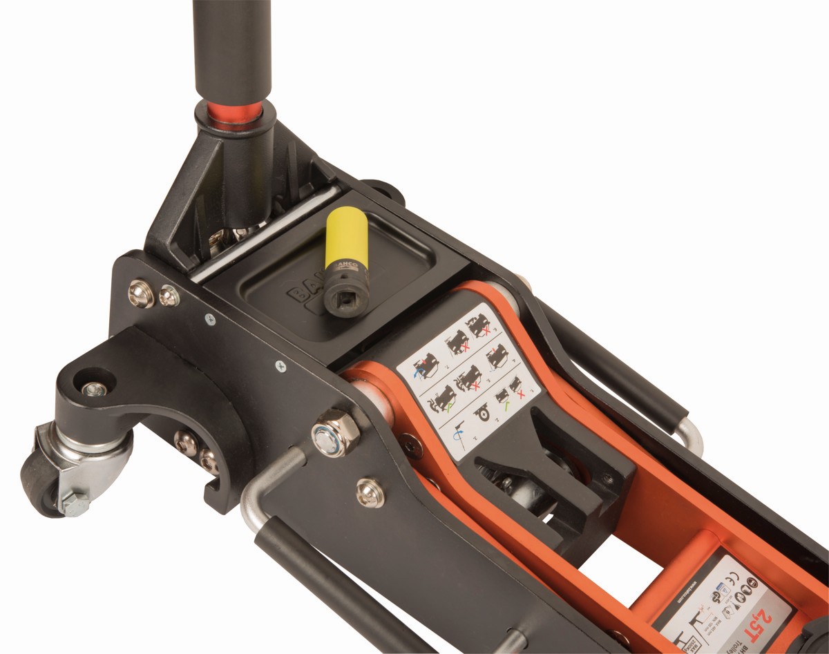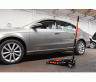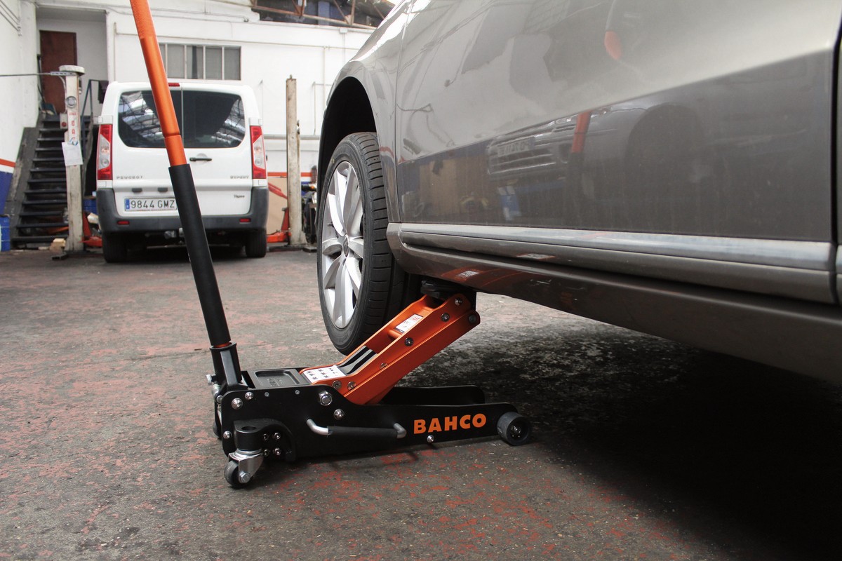 - Gato hidráulico de 2,5 T con una estructura de aluminio 100 % para mantenimientos en carretera y talleres.