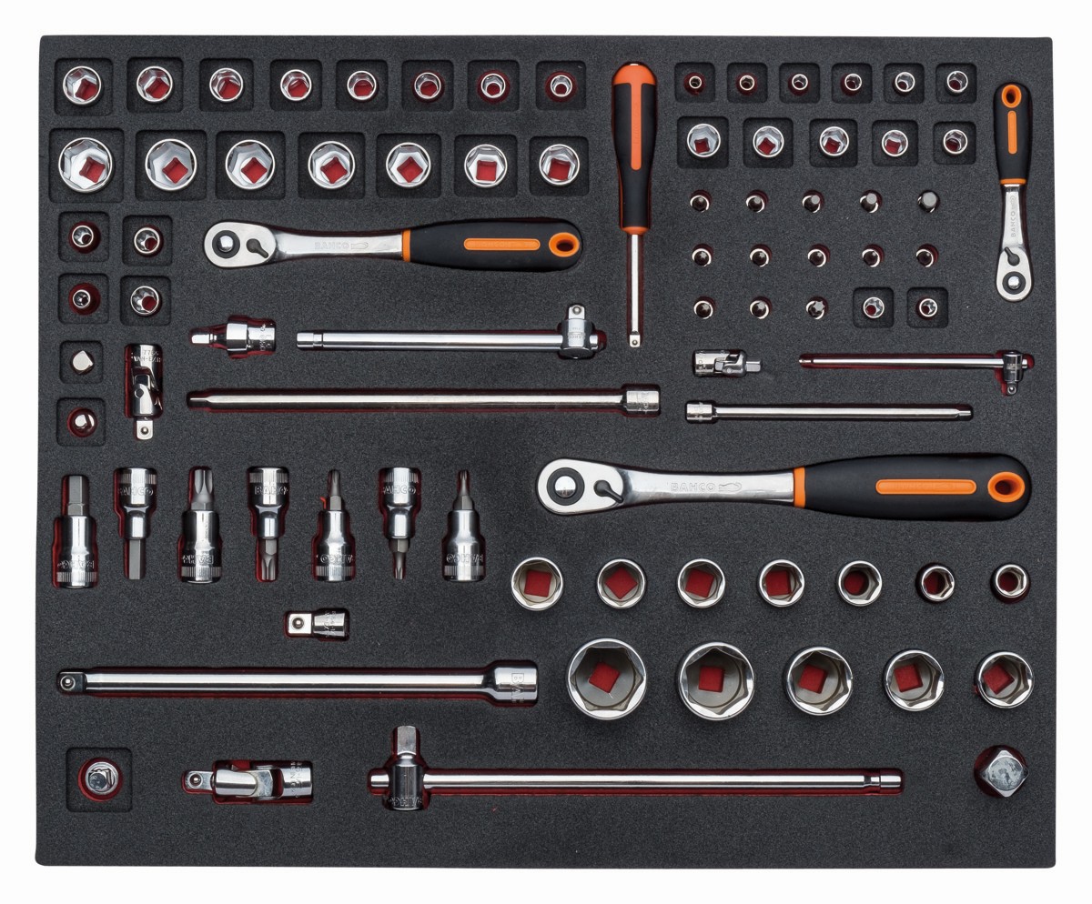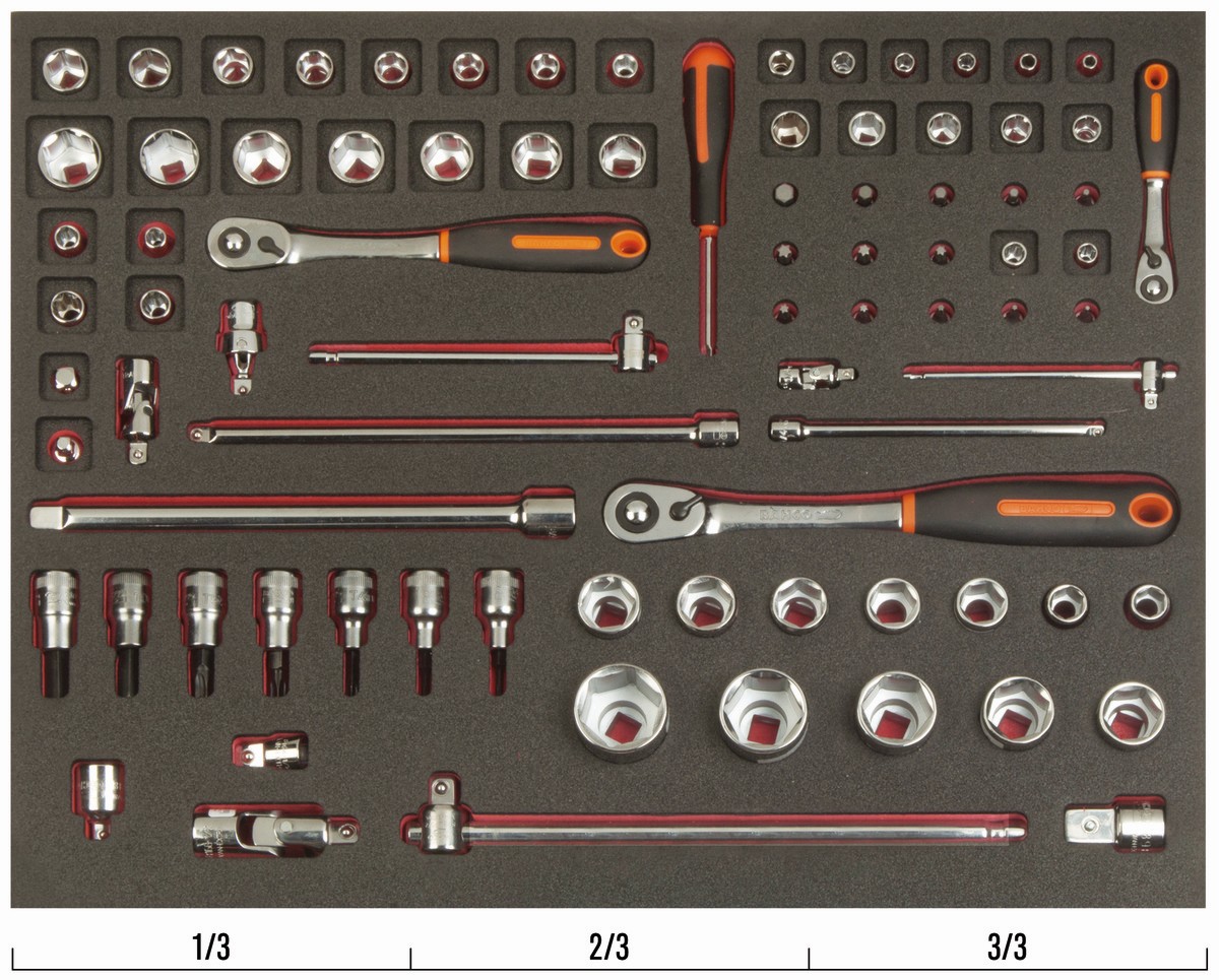 Juego de carraca de cabeza tipo pera/redonda y vasos de 1/4" + 1/2" + 3/8" en bandeja de foam 3/3 Fit&Go, 83 piezas | FF1A2501