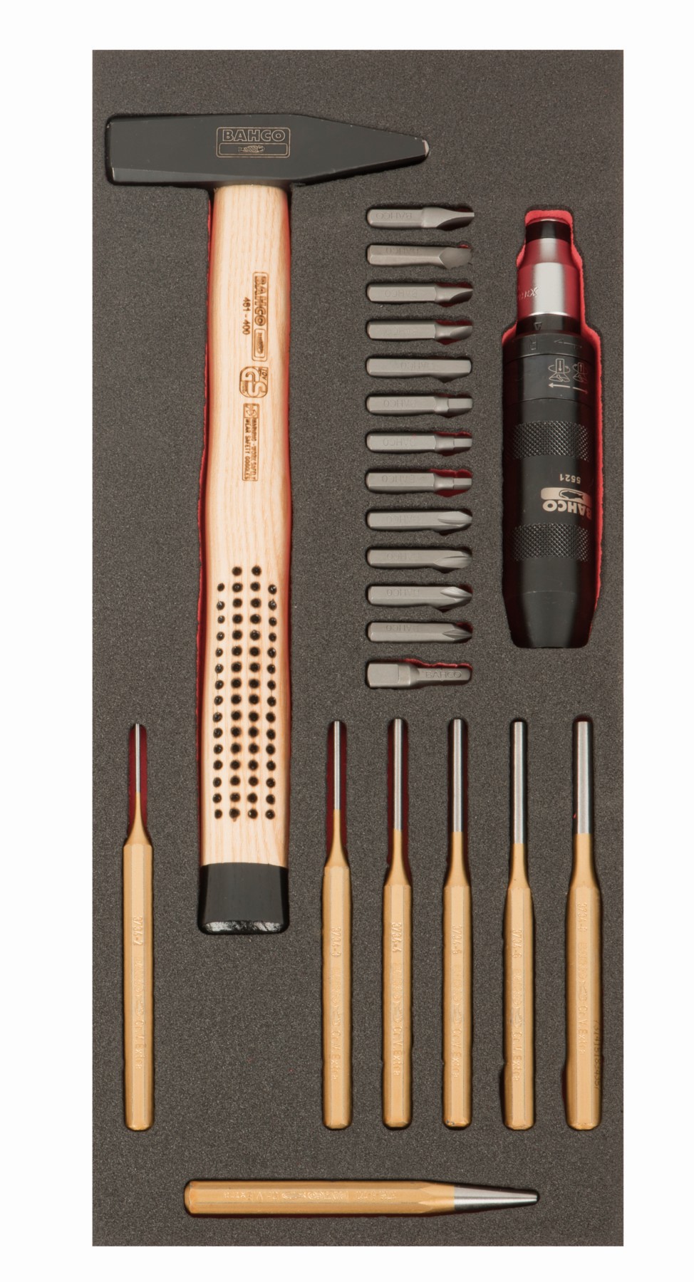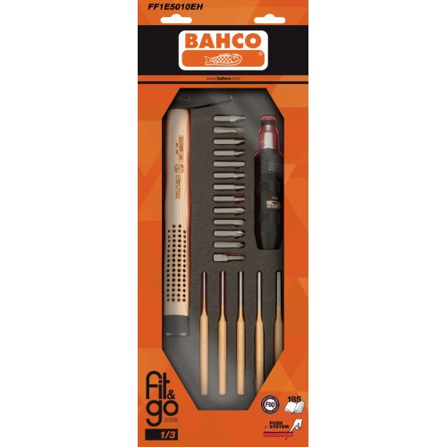 BAHCO Juego de martillo, botadores y destornillador a golpe en bandeja de foam 1/3 Fit&Go (23 piezas, blíster) | FF1E5010EH