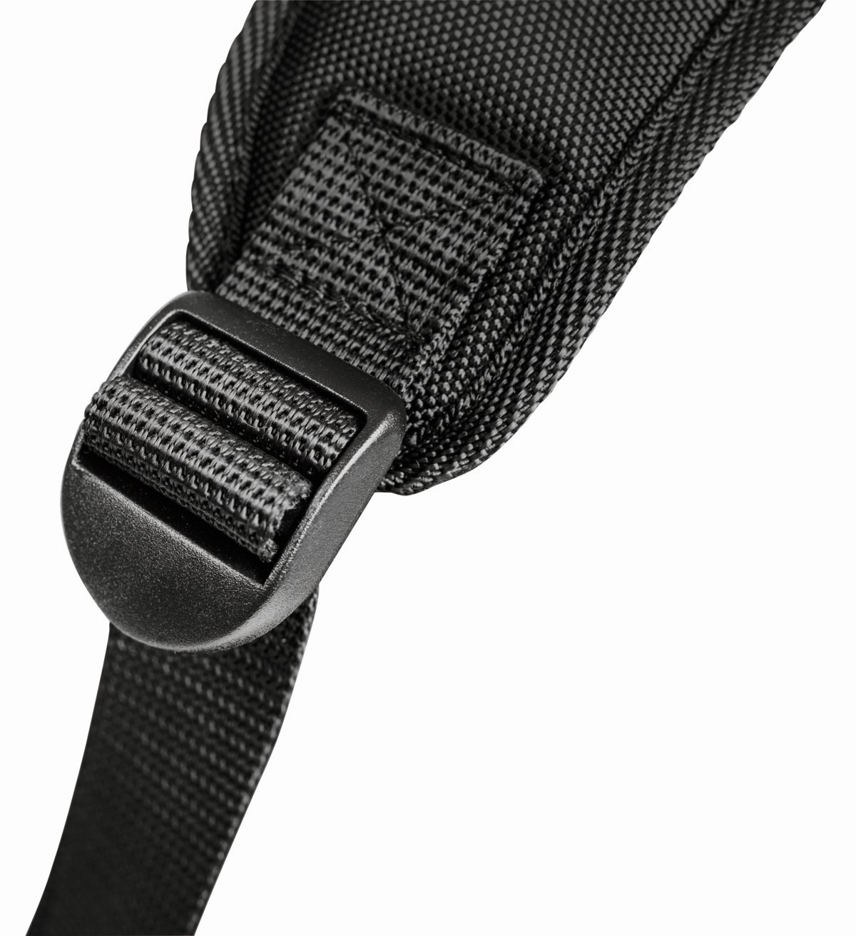 • El tirador ergonómico de plástico unido al extremo de la cinta de polipropileno ayuda a ajustar la longitud de los cinturones de tirantes