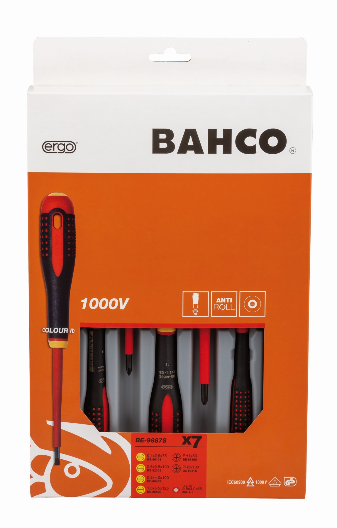 - Comprobador de tensión 806-1-1 (0,6 x 3 x 65 mm) y destornilladores Phillips BE-8610S y BE-8621S (PH1 x 80 mm y PH2 x 100 mm).