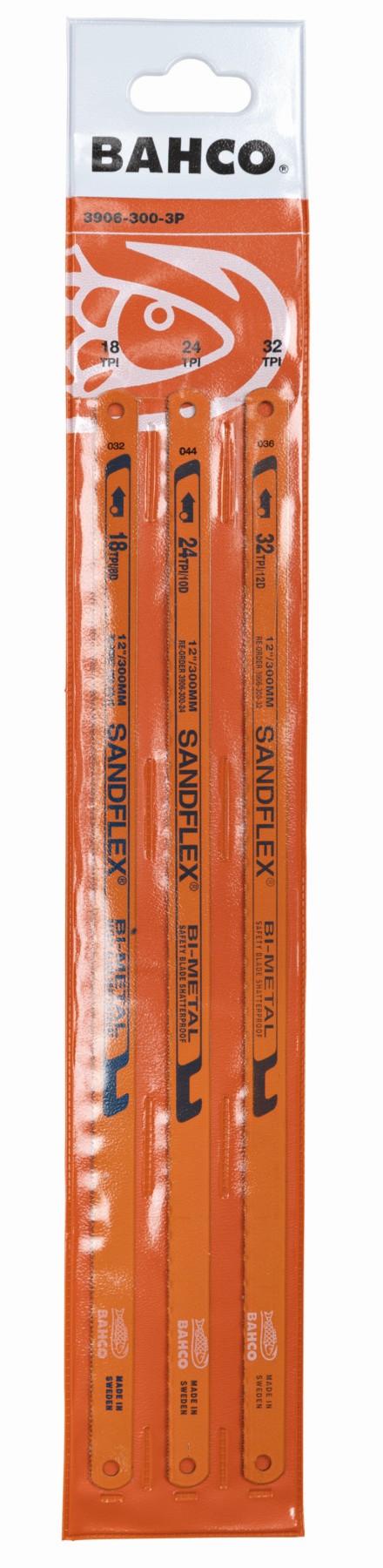 - -3P: 3 hojas, 1 cada una de 18, 24 y 32 TPI, en bolsa de plástico, caja de 10 paquetes