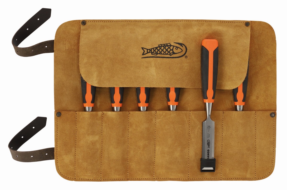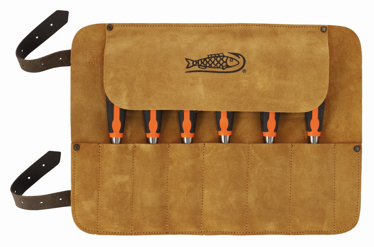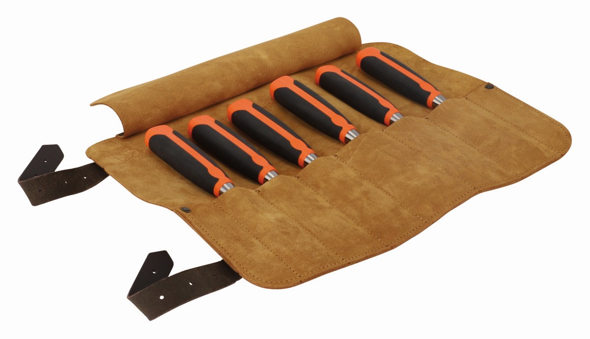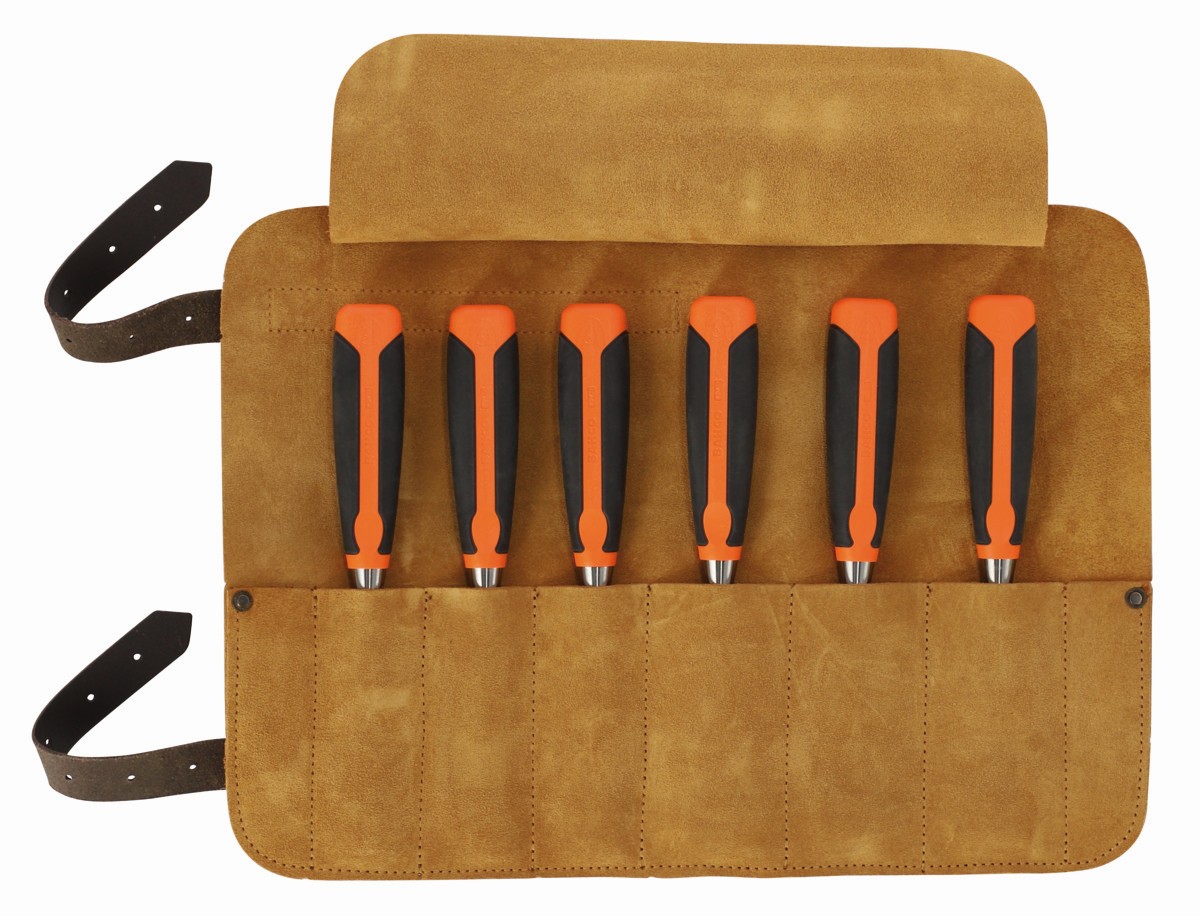 Juego de cinceles profesionales con mango bi-componente en un estuche enrollable de cuero (6 piezas) | 424P-S6-LR