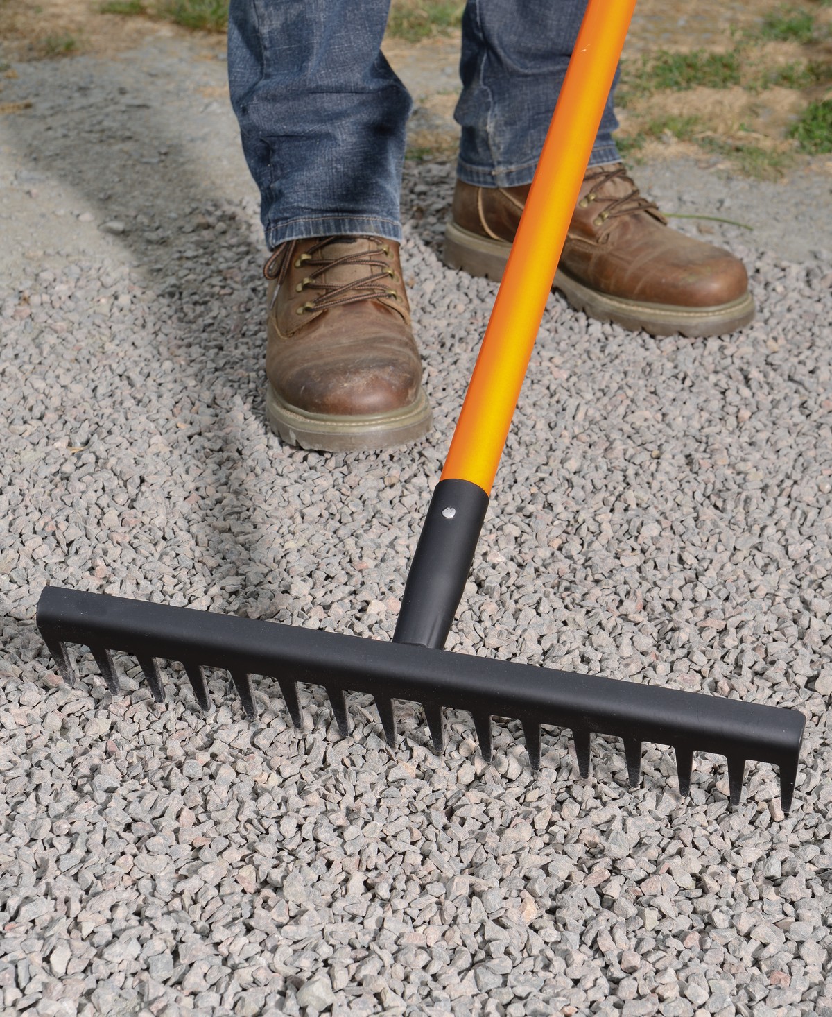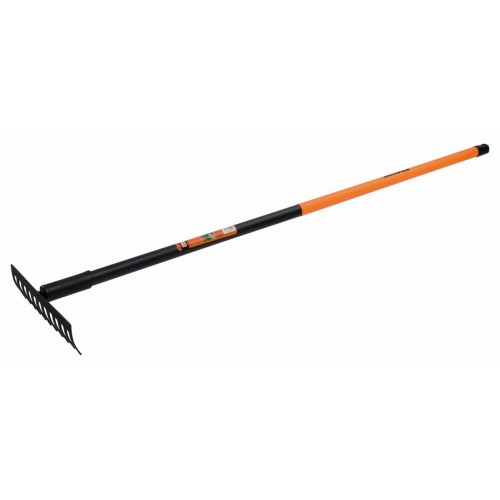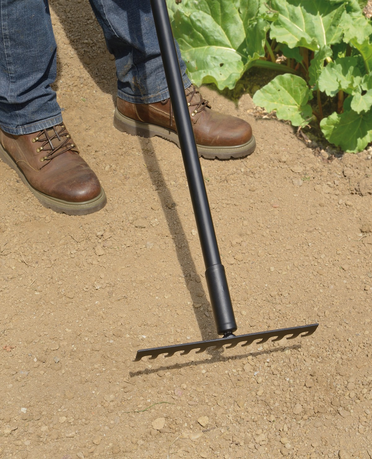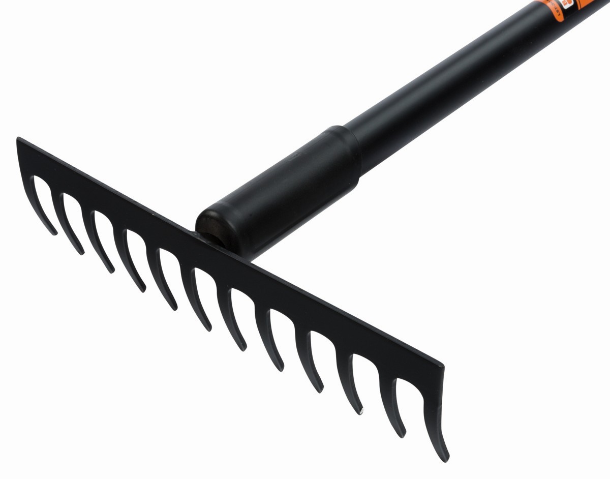 - Cabeza de acero al carbono ideal para preparar el suelo en bordes y nivelarlo antes de sembrar