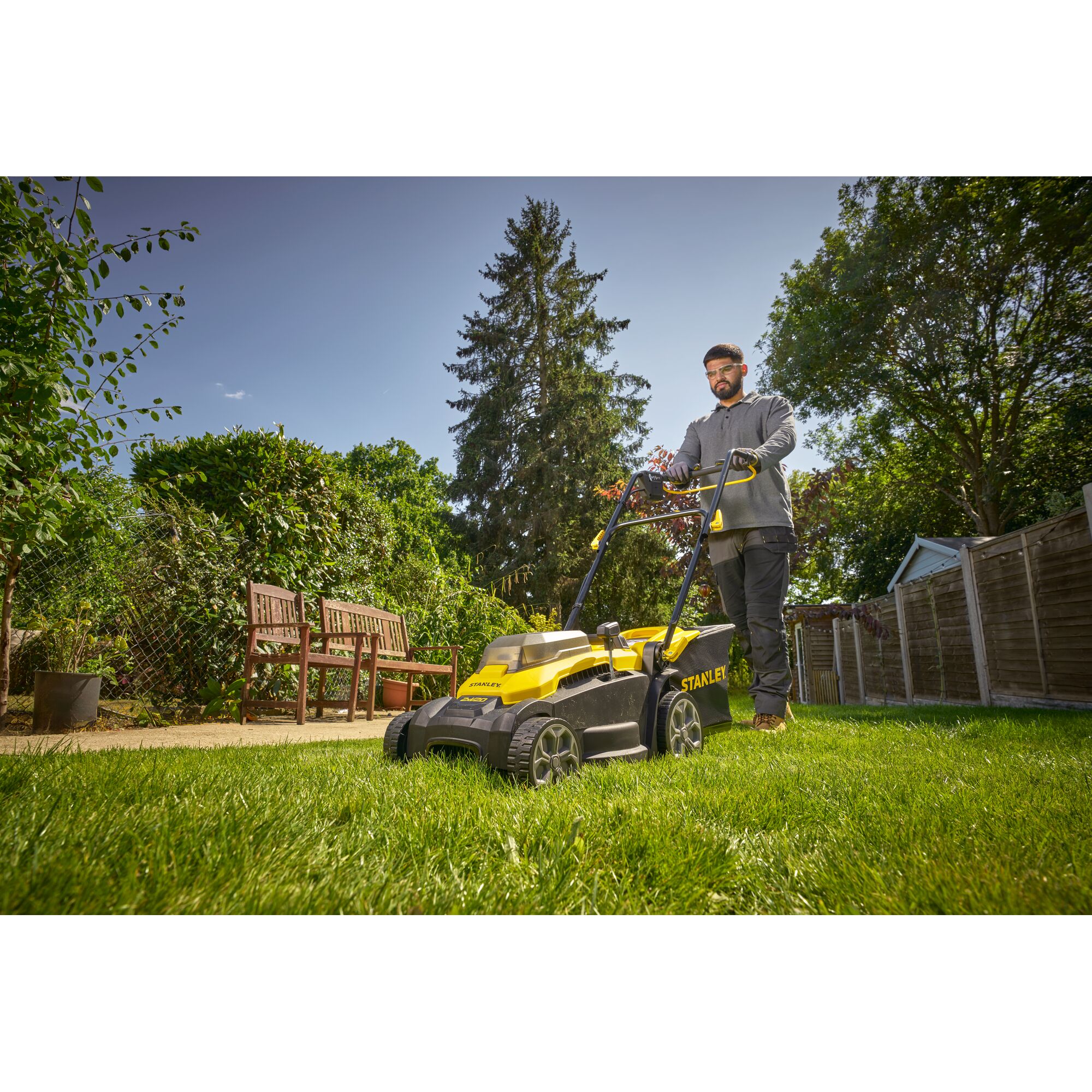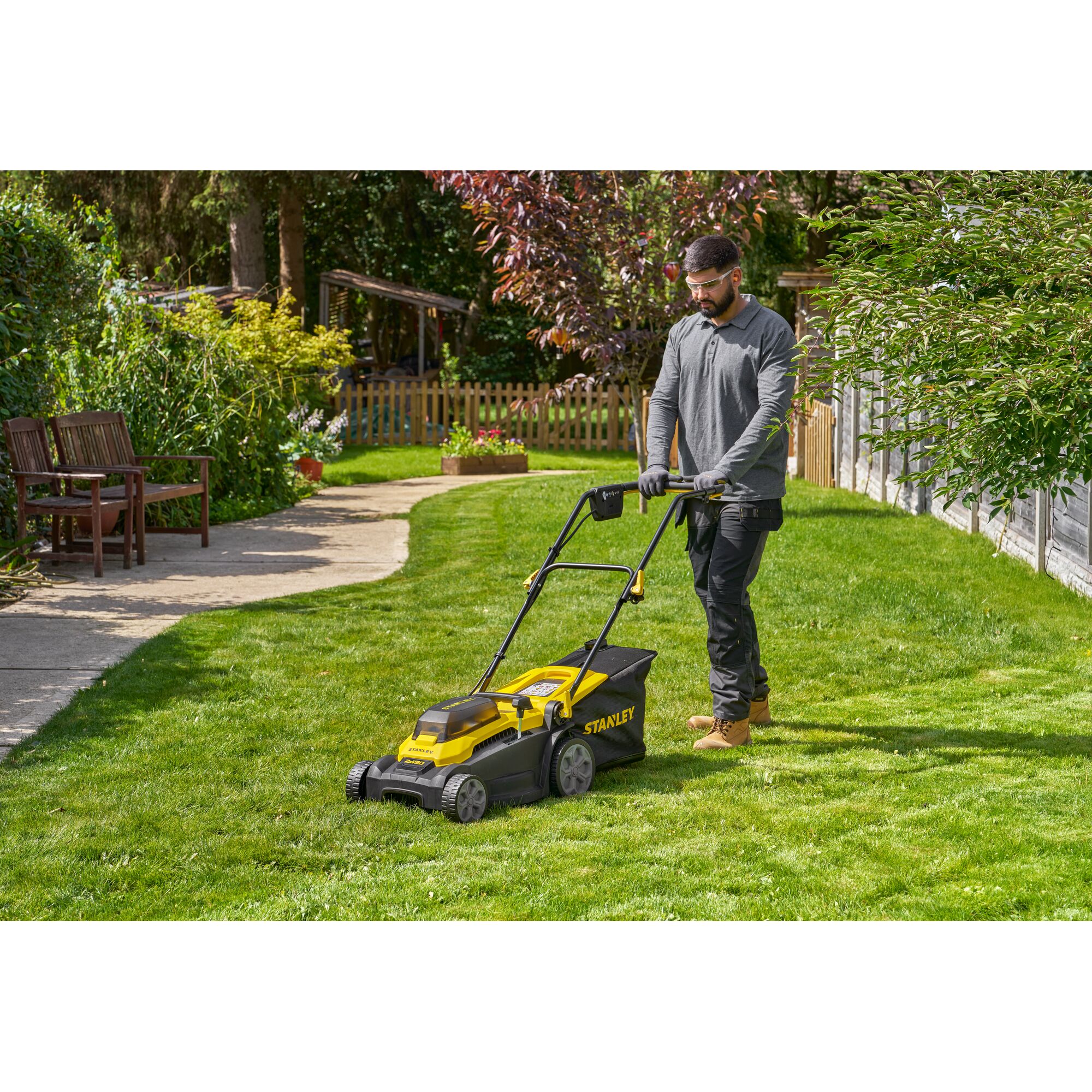 El cortacésped STANLEY® 2xV20 de 18V de 37 cm es una excelente alternativa a las cortadoras con cable o de gasolina, ya que ofrece la máxima comodidad y libertad sin cable, sin el desorden ni el ruido de los productos tradicionales. Esta cortadora de césped de alto rendimiento, la mejor de su clase, combina potencia y practicidad, e incluye funciones de recolección, mulching y descarga trasera sin necesidad de accesorios como un tapón de mulching. Sus asas plegables en dos puntos, que ahorran espacio, facilitan el almacenamiento y lo hacen más práctico. La anchura de corte de 37 cm es perfecta para céspedes pequeños y medianos, con una espaciosa bolsa de recogida de hierba de 45 litros. El innovador sistema Advanced Cut & Collection de STANLEY® cuenta con un sistema de corte y llenado de la bolsa asistido por flujo de aire para obtener la máxima calidad de corte y rendimiento de embolsado. Diseñado ergonómicamente, el cortacésped está equipado con un cómodo mango de tracción con activación intuitiva mediante botón pulsador. Versátil y fácil de usar, este producto incorpora un sistema de ajuste de la altura de corte central de 6 posiciones (25-75 mm) para un corte preciso y un mango de 3 posiciones con opciones de altura ajustable. Con su motor sin escobillas de alta eficiencia y la fiable tecnología de batería de iones de litio de 18V V20, que ofrece una gran autonomía por carga, el cortacésped está listo para trabajar cuando usted lo esté. Gracias al sistema de baterías inalámbricas STANLEY® V20 de 18V, las baterías son compatibles con todos los equipos STANLEY® V20. Esta cortadora de césped de 37 cm viene con dos baterías STANLEY® 18V 4Ah V20 y dos cargadores.