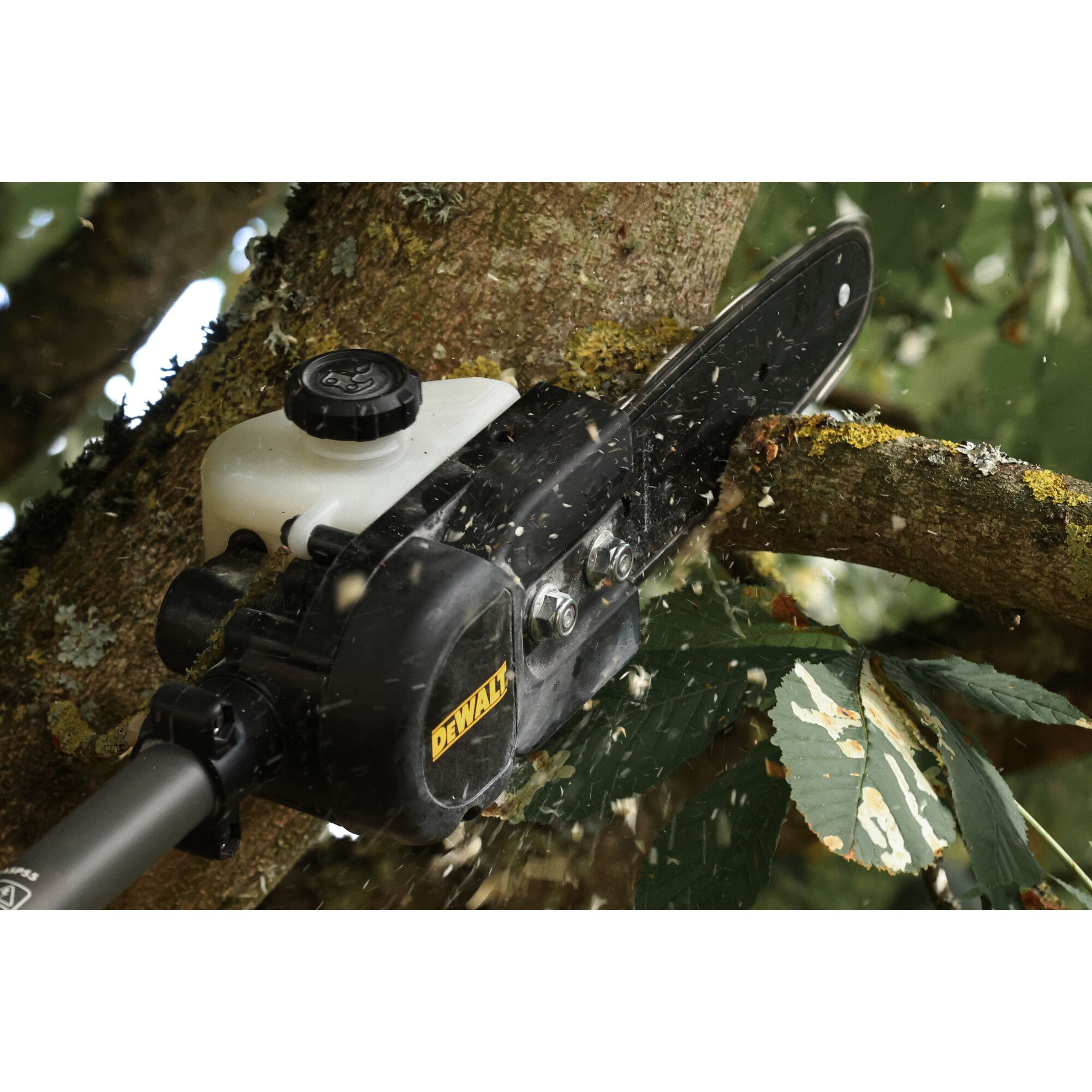 Barra y cadena DEWALT de 20 cm con un diámetro de corte efectivo de 15 cm: corta ramas más grandes.