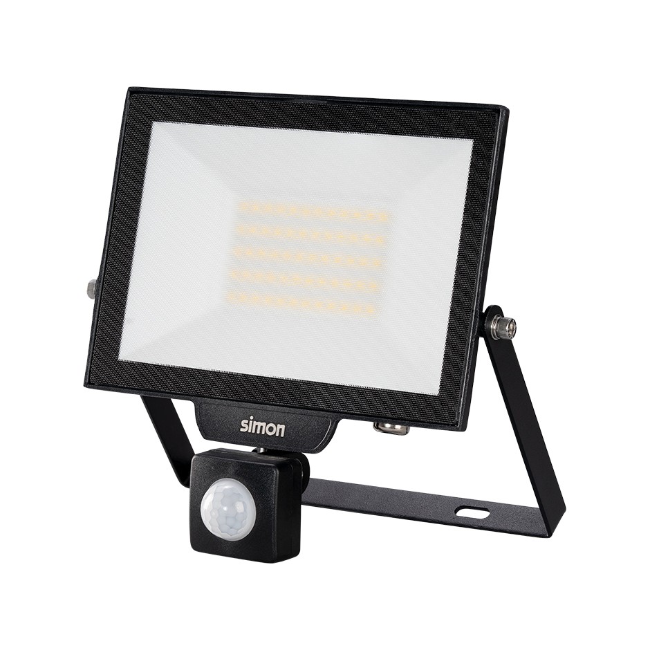 Proyector LED de SIMON fabricado en aluminio con acabado en negro. Ofrece iluminación en luz blanca neutra (4000K) con una potencia de 50 vatios y una intensidad de 5000 lúmenes, proporcionando una luz clara, potente y eficiente para diferentes áreas de instalación. Este modelo incorpora sensor PIR, que permite el encendido automático al detectar movimiento, favoreciendo el ahorro energético y aportando un plus de seguridad y comodidad. Su protección IP44 lo hace resistente a la humedad y a las salpicaduras, ideal para espacios interiores o exteriores protegidos. Incluye un soporte orientable, que permite ajustar el ángulo de iluminación de forma precisa según las necesidades del entorno.