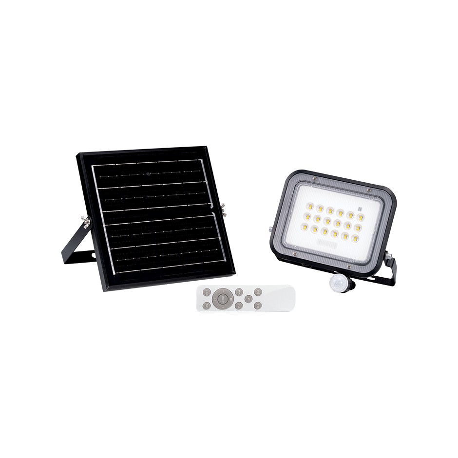 Proyector LED solar de SIMON fabricado en materiales resistentes y con acabado en negro. Ofrece iluminación en luz blanca neutra (4000K) con una potencia de 50 vatios equivalentes y una intensidad de 800 lúmenes, proporcionando una luz suave y eficiente ideal para exteriores. Funciona mediante energía solar, incorporando un panel fotovoltaico que permite su carga autónoma y sostenible. Además, integra sensor PIR, que activa la iluminación al detectar movimiento, optimizando el consumo energético y aportando mayor seguridad en zonas de paso. Su protección IP66 garantiza una alta resistencia al polvo y a chorros de agua, siendo perfecto para instalaciones en exteriores exigentes. Incluye un soporte orientable, que permite ajustar el ángulo de iluminación de acuerdo con las necesidades del entorno.