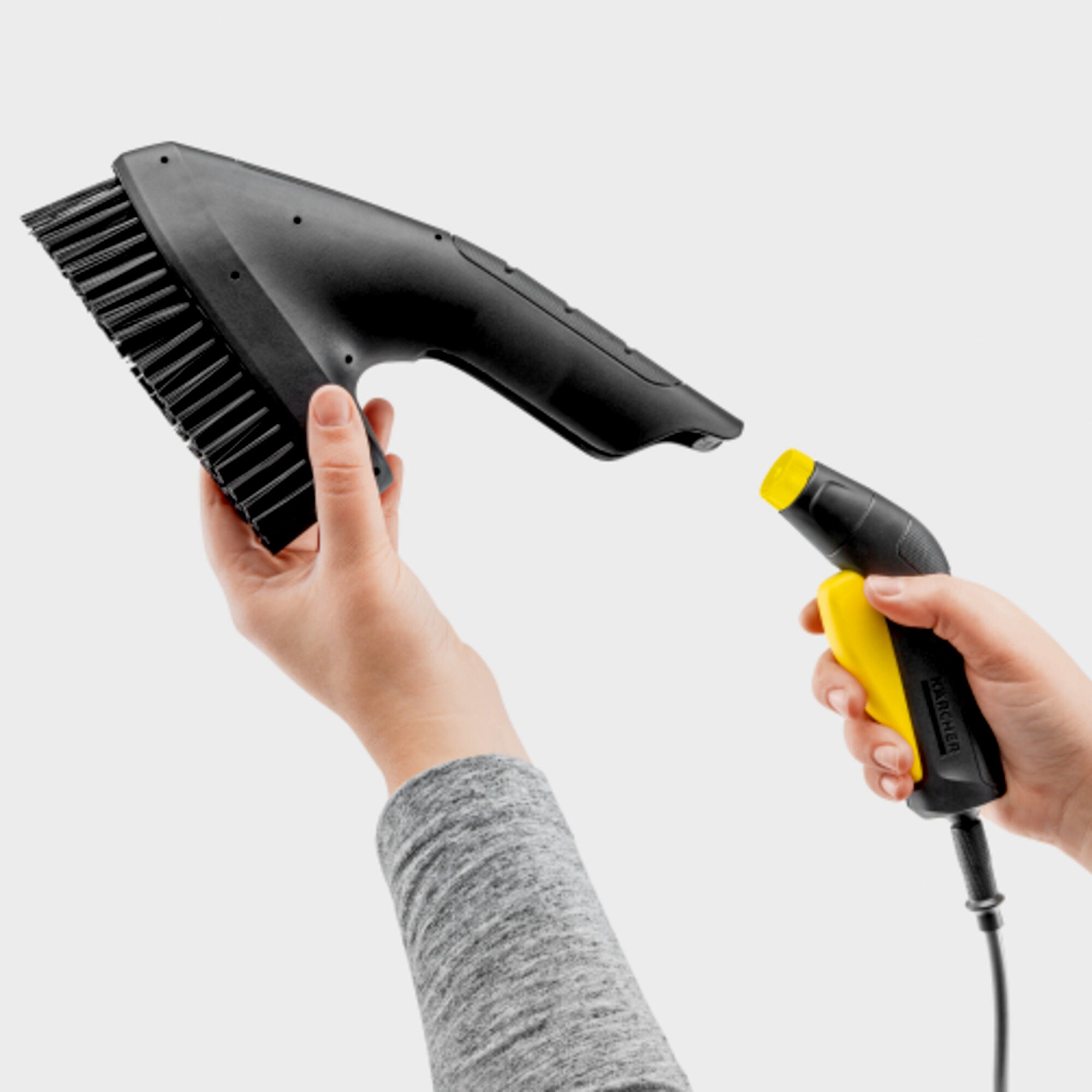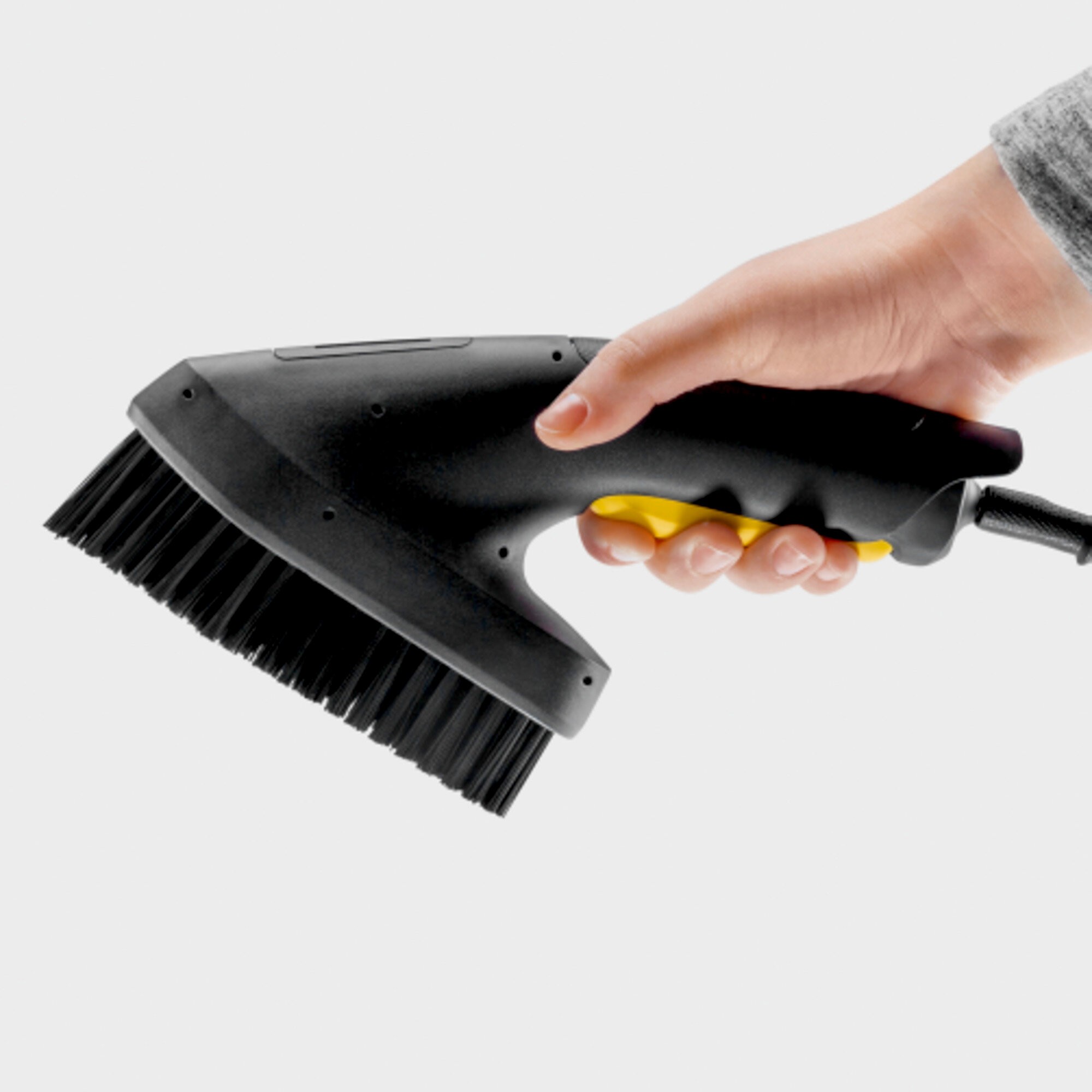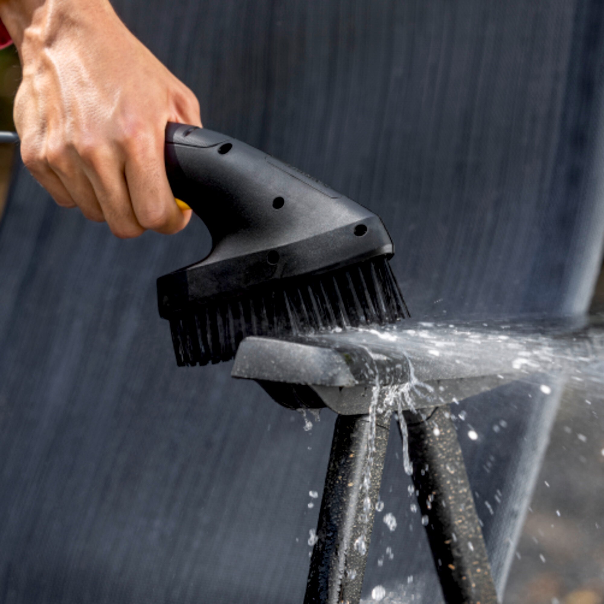 El cepillo para fregado es ideal para desprender y eliminar rápidamente la suciedad más resistente, como una película pegajosa de polen en los muebles de jardín o suciedad incrustada. Su combinación de chorro a presión y cerdas garantiza también un efecto de limpieza especialmente potente, incluso para una limpieza rápida. Los campos de aplicación pueden ser, por ejemplo, muebles de jardín, bicicletas y otro equipamiento de actividades al aire libre. El cepillo se monta directamente en la pistola. Con su perfil antideslizante y su forma ergonómica, el cepillo se adapta cómodamente a la mano para un trabajo seguro y sin fatiga. Puesto que el agua solo se utiliza cuando se acciona el gatillo del equipo, el consumo de agua se puede ajustar de forma muy eficiente y según las necesidades particulares. Esto sirve, a su vez, para cuidar la batería. El cepillo para fregado es compatible con todas las limpiadoras portátiles OC 3.