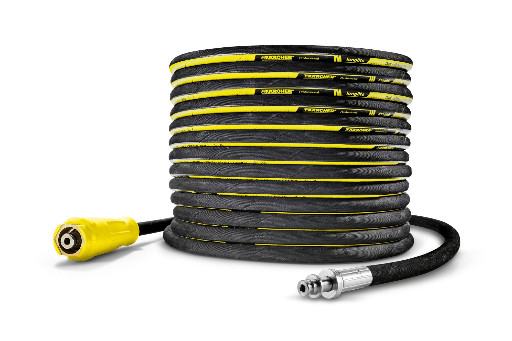 Manguera de alta presión de 20 m Longlife 400 (AN 8) con conexión AVS patentada en la pistola (alojamiento giratorio) y acoplamiento de rosca manual. M 22 x 1,5 con protección contra flexiones. Con doble refuerzo de alambre de acero con máxima resistencia a la tracción. Otros datos fundamentales: AN 8 / 155 °C / 400 bar.