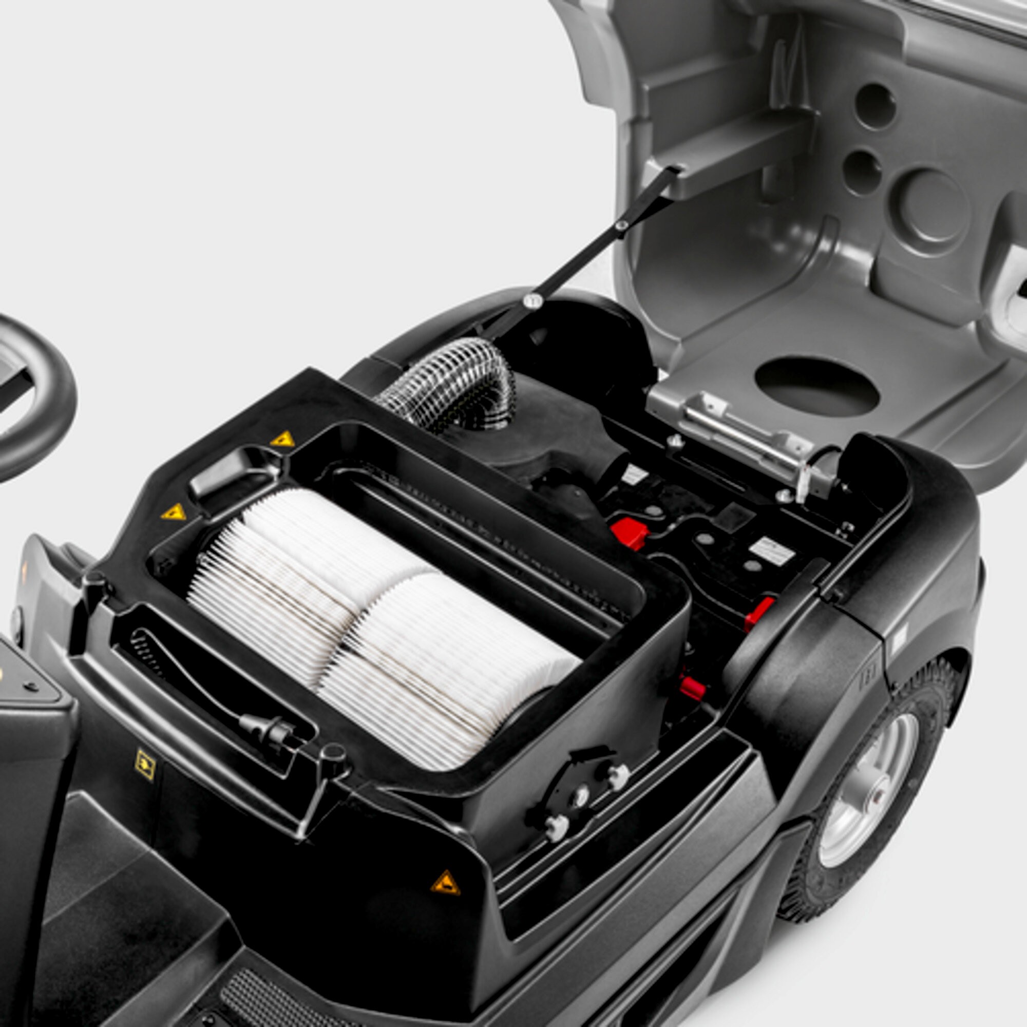 El filtro se limpia automáticamente después de cada parada de la máquina: para barrer siempre con poco polvo y disponer de intervalos de trabajo prolongados.