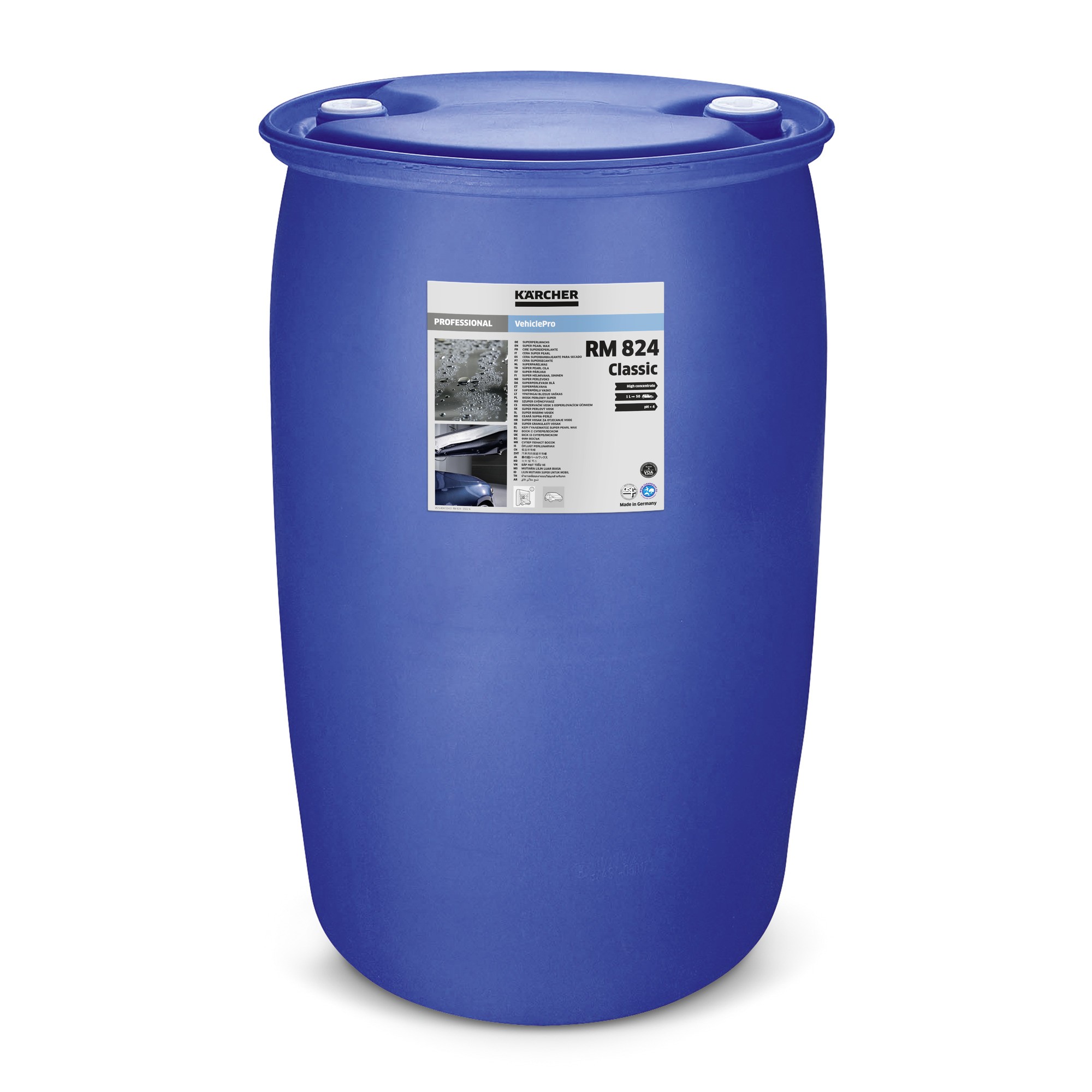 Nuestra supercera granulada líquida VehiclePro RM 824 Classic es un eficaz agente de secado, ideal para su uso en instalaciones de lavado de vehículos, así como con hidrolimpiadoras. El detergente es especialmente eficaz cuando se utiliza agua de dureza media a dura; hace que la película de agua se rompa rápidamente en una gran superficie, garantizando así un excelente resultado de secado. La cera hace que la pintura brille más y cumple además la normativa VDA, ya que no contiene aceites minerales ni hidrocarburos minerales. Además, los tensioactivos que contiene son biodegradables conforme a EEC 648/2004. Su elevado rendimiento, de hasta 83 automóviles por litro, hace que el producto resulte muy rentable.