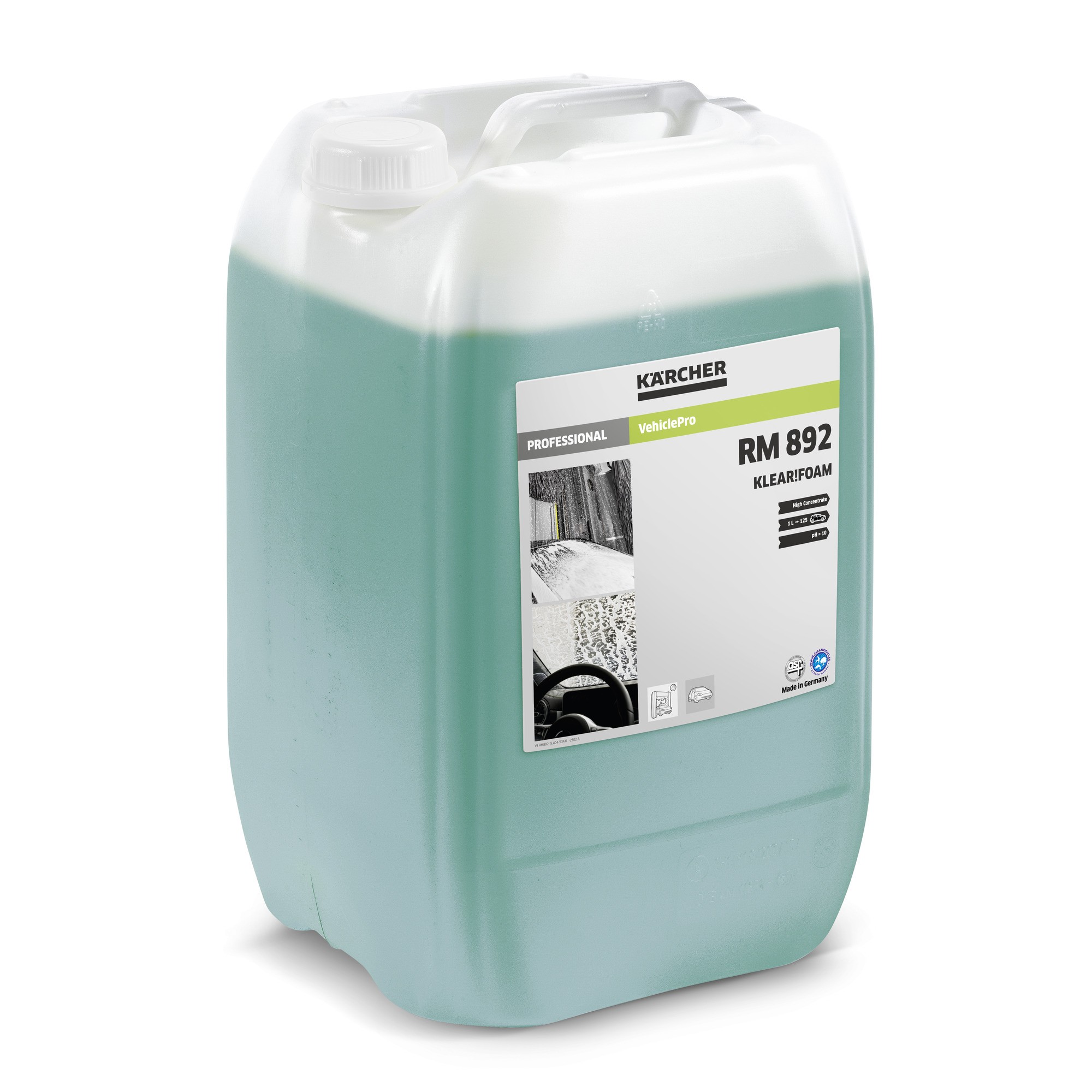 Cuando se utiliza en instalaciones de lavado de vehículos, nuestra espuma activa VehiclePro Klear!Foam RM 892 convence por su gran rendimiento, menor dosificación y muy buenos resultados de limpieza. El detergente espumante altamente concentrado elimina de forma fiable el aceite, la grasa y la suciedad mineral, al tiempo que facilita el deslizamiento de los cepillos, para una limpieza especialmente suave de automóviles y vehículos comerciales. Además, crea un manto de espuma estable y fácil de aclarar, con gran capacidad de arrastre de la suciedad, y gracias a su efecto hidrófobo prepara las superficies para un secado perfecto. Ajustando la dosis, Klear!Foam RM 892 también puede utilizarse para la limpieza mediante lluvia/cortina de espuma o como champú para los cepillos. Los tensioactivos que contiene son biodegradables según la OCDE.