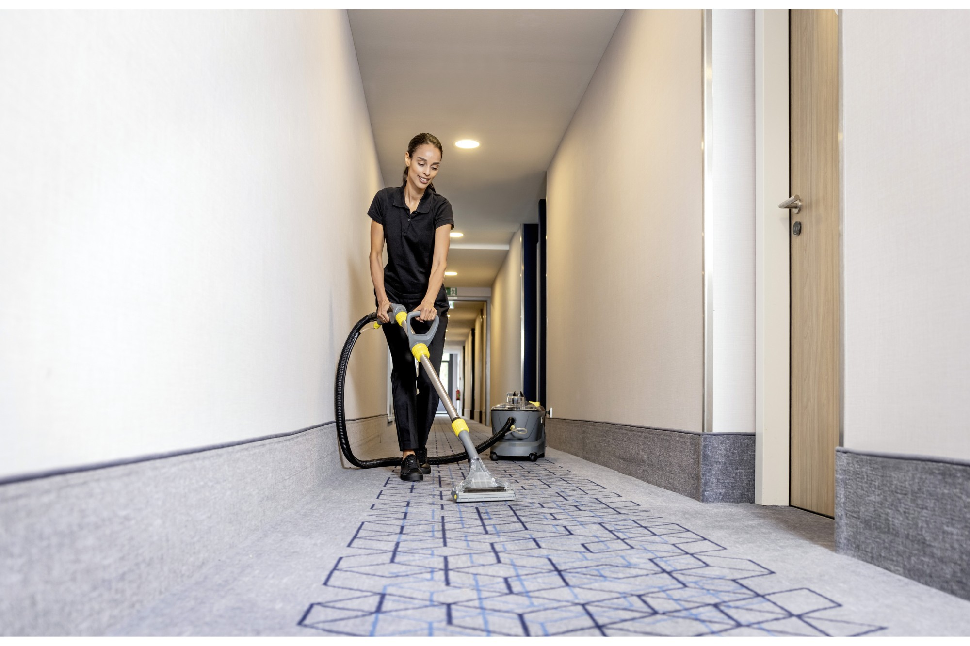 Limpie los recubrimientos textiles en trayectorias solapadas con el procedimiento de un paso (pulverizar / aspirar en un único procedimiento) o el procedimiento de dos pasos (pulverizar / dejar actuar y, a continuación, aspirar).
