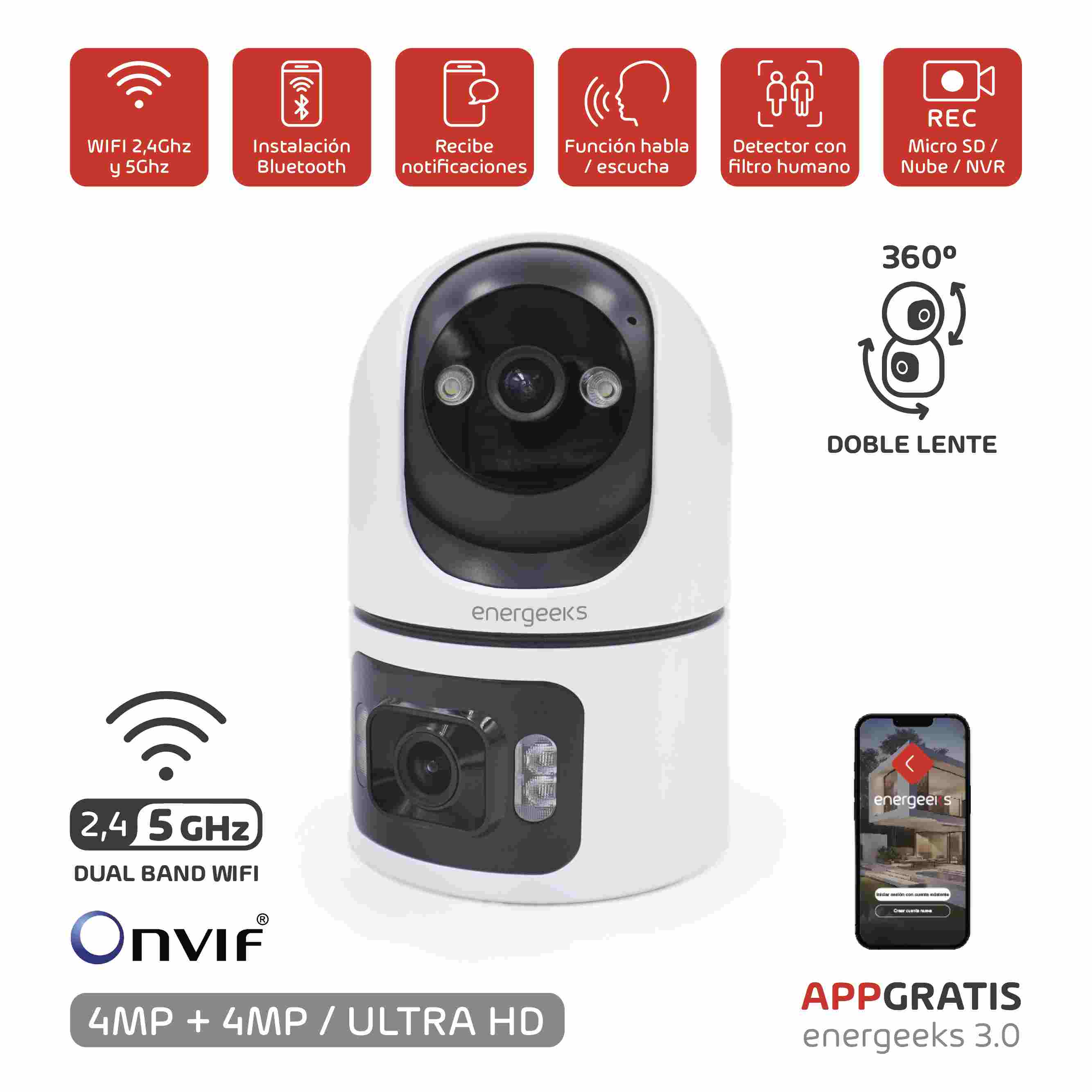 Sentinel Duo es totalmente compatible con tarjeta Micro SD, grabación en la nube y sistemas NVR, además de ser compatible con el protocolo ONVIF, lo que la convierte en una opción ideal para sistemas de grabación inalámbricos. El uso de WiFi 5G en entornos con varias cámaras permite evitar la saturación de la red y mantener una transmisión fluida sin afectar al resto de dispositivos.Integrada en el ecosistema Energeeks 3.0, Sentinel Duo se comunica y complementa con el resto de dispositivos de la gama, ampliando las posibilidades de tu sistema de seguridad y domótica. Una cámara diseñada para quienes buscan máxima cobertura, tecnología avanzada y control total, todo en un único dispositivo.